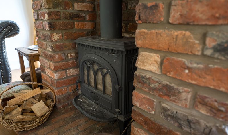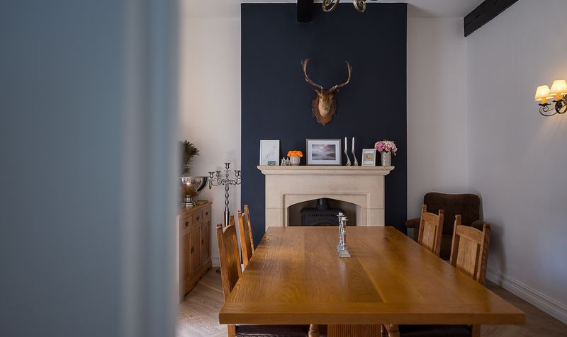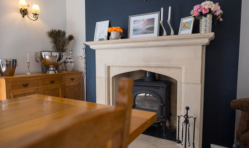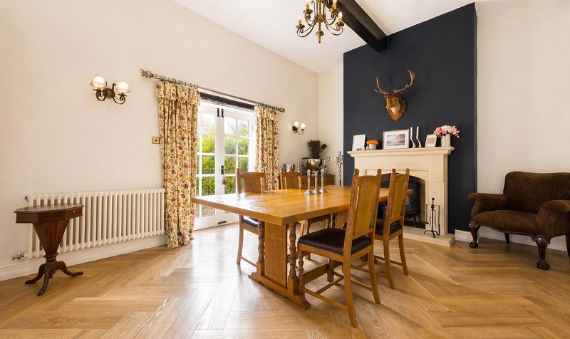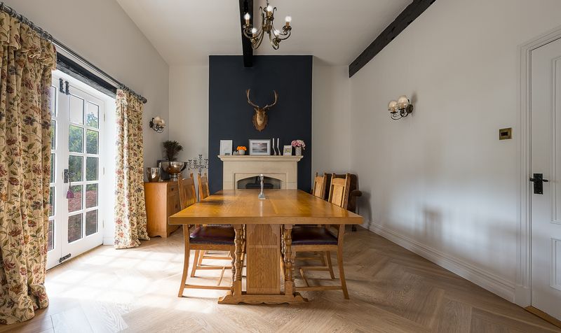 Also accessed from the entrance hall, the separate dining room provides a more intimate yet equally charming space, centred around a feature fireplace with a log-burning stove. French doors allow natural light to pour in while providing direct access to the garden, making it perfect for both everyday dining and more formal occasions.