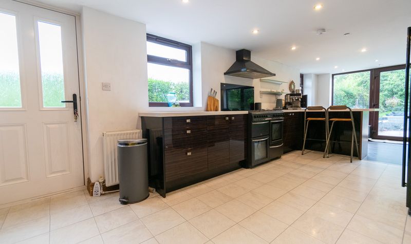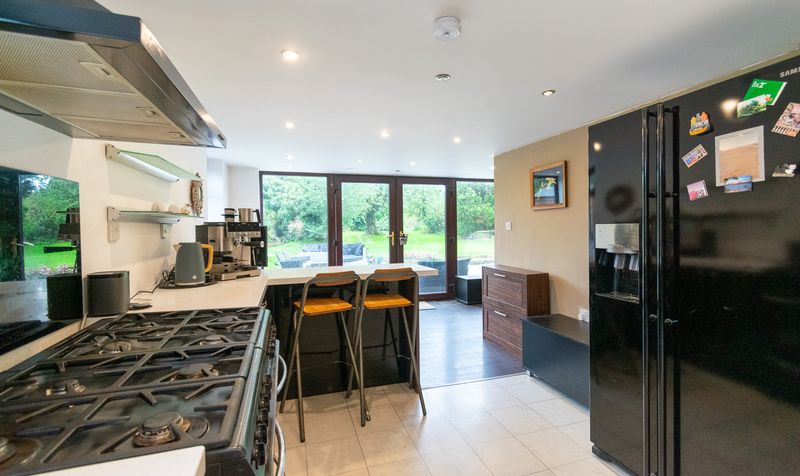 Wrapping around the property lies the kitchen, designed to be both stylish and functional. With sleek units, a range-style cooker, central island with breakfast bar, and generous counter space, it is a room made for cooking, socialising, and entertaining. Multiple windows and direct access to the rear patio keep the space bright and connected to the outdoors, while a utility room, downstairs WC, and private office provide the practicality every modern household needs.