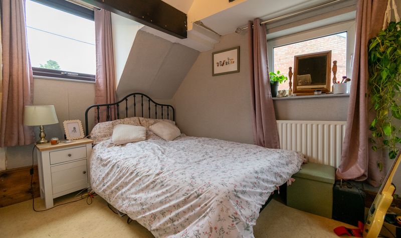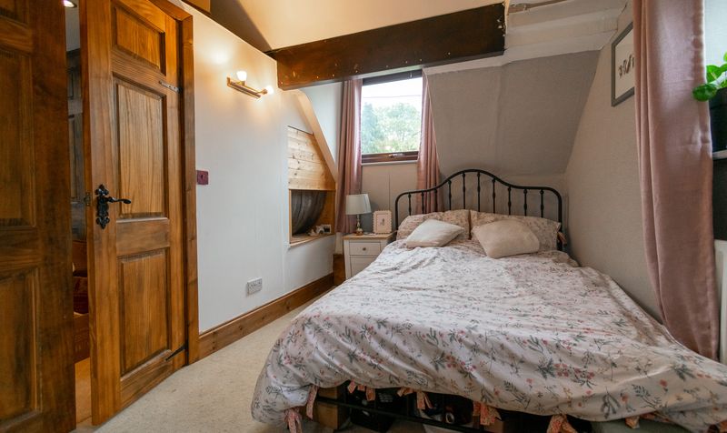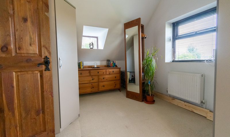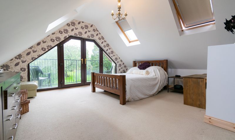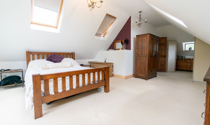 The principal suite is a truly impressive feature of the home, spanning the top floor and offering a sense of space and light that is rarely found. With multiple skylights and a striking set of double doors that open onto a Juliet balcony, the room frames far-reaching views over the beautifully maintained gardens and surrounding countryside. Its generous proportions allow space for a king-sized bed and wardrobes, with the flexibility to create a separate sitting or dressing area, making it a luxurious sanctuary at the end of the day.