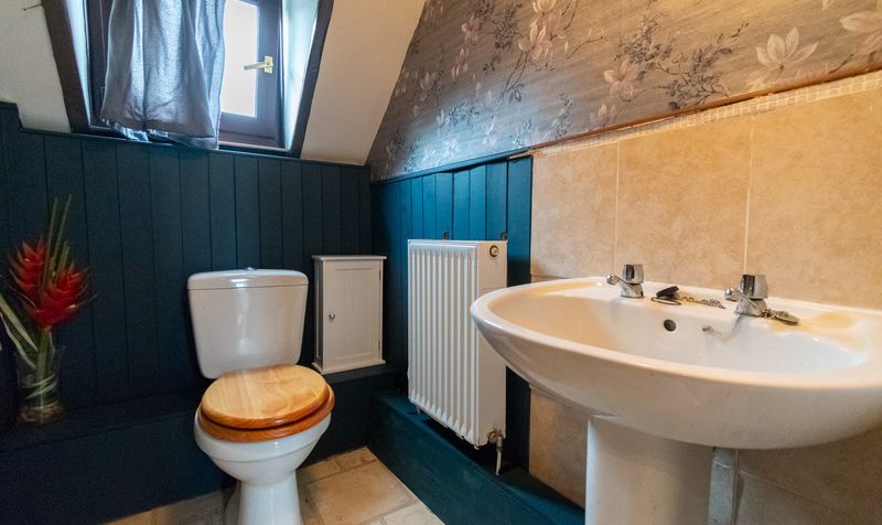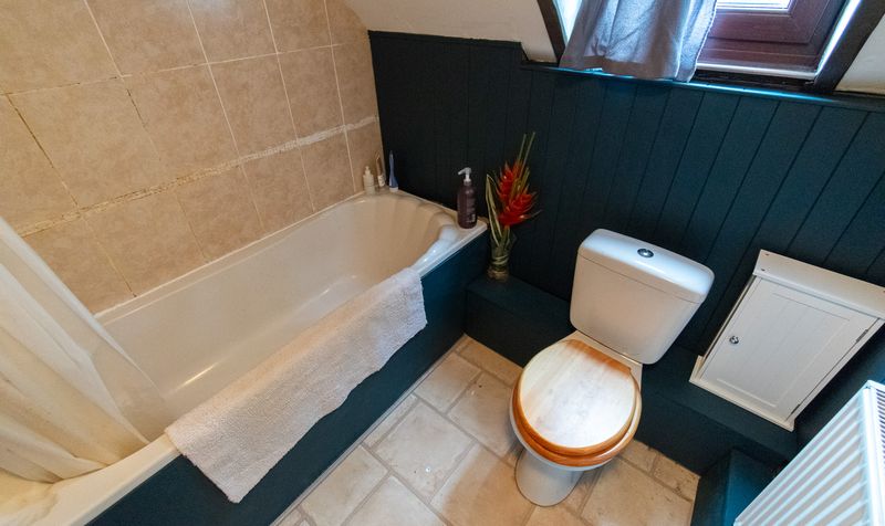 The family bathroom is thoughtfully designed to offer both practicality and comfort, with a layout that makes the most of the space. A fitted panelled bath with overhead shower provides versatility for both quick morning routines and long, relaxing soaks, while the tiling around the bath adds a neutral and timeless finish. The room also features a pedestal wash hand basin and a low-level WC, all set against a backdrop of part-panelled walls and natural tones that create a homely, traditional feel.