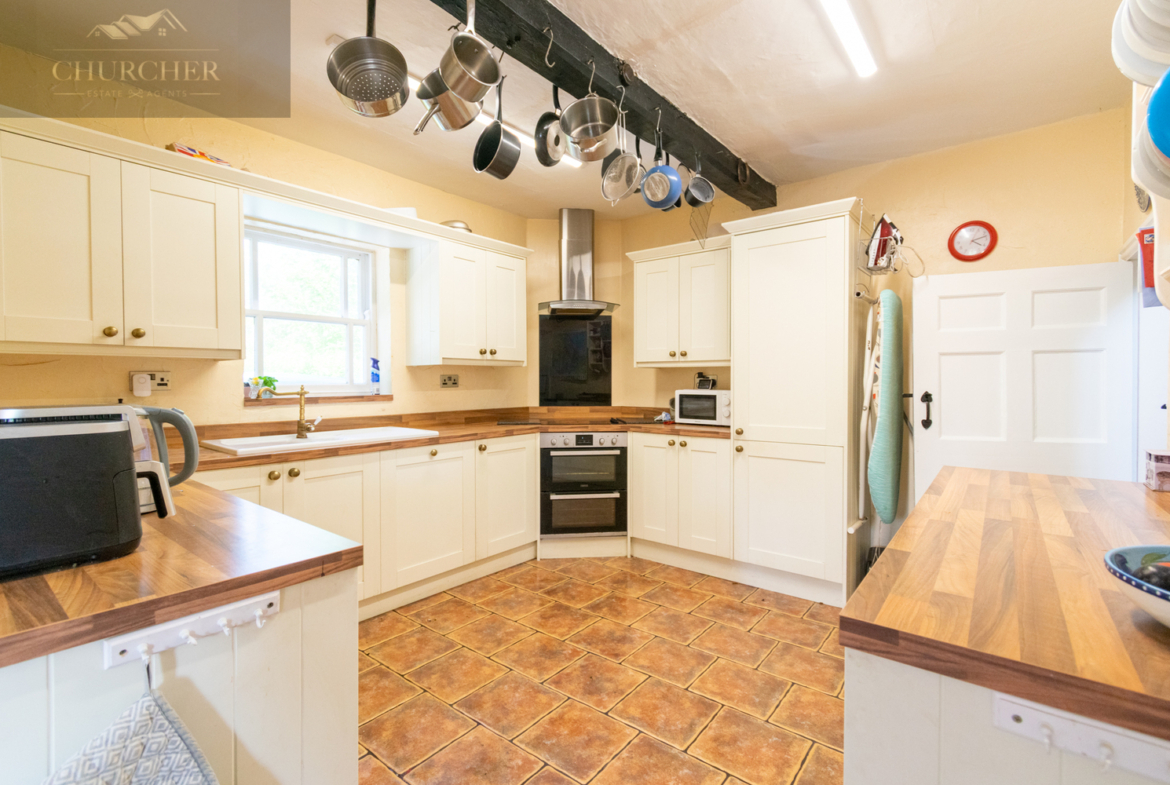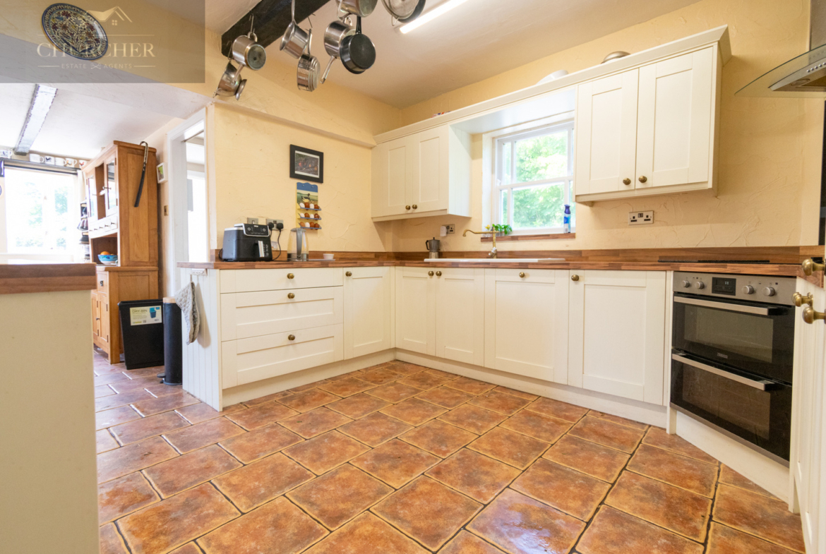 Step inside the house, through the welcoming rear entrance into the charming country-style kitchen-where rustic beams, tiled floors, and warm farmhouse character create a cosy yet practical space perfect for both everyday family life and relaxed entertaining.