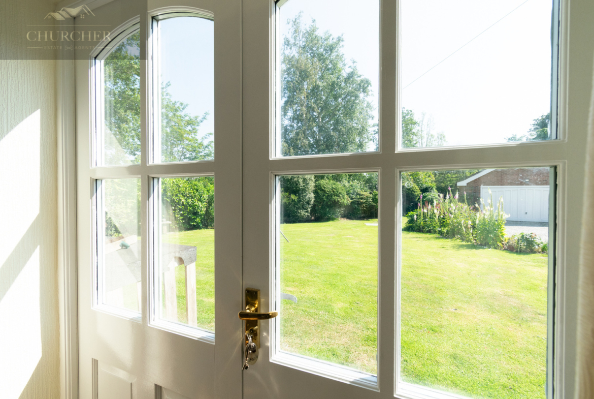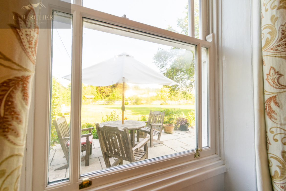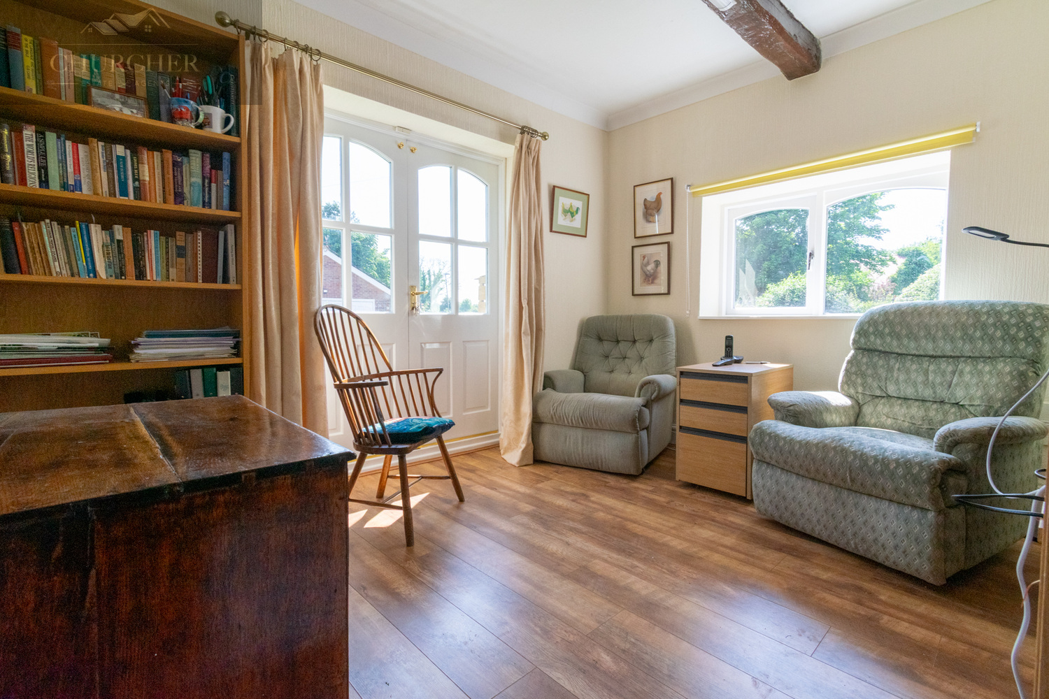 Completing the ground floor is a dedicated study/snug – a peaceful and flexible space tucked away from the main living areas, ideal for those seeking a quiet spot to work from home, study, or simply unwind. Full of charm, the room features exposed beams and traditional timber finishes, continuing the farmhouse character found throughout the property. Natural light pours in through the sash-style window, while a set of double doors open directly out to the garden, creating a wonderful indoor-outdoor connection and allowing fresh air and countryside views to flow into the space. Whether used as a home office, a cosy reading room, or a hobby area, this versatile space adds valuable functionality to the home. A walk-in storage cupboard beneath the stairs also provides a neat solution for keeping everyday essentials tucked away.