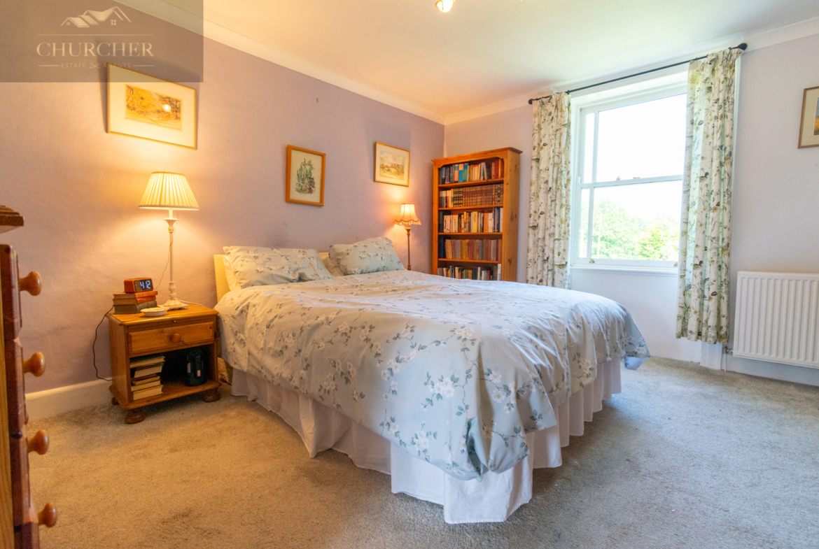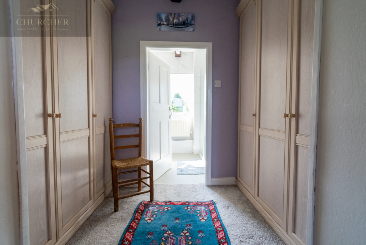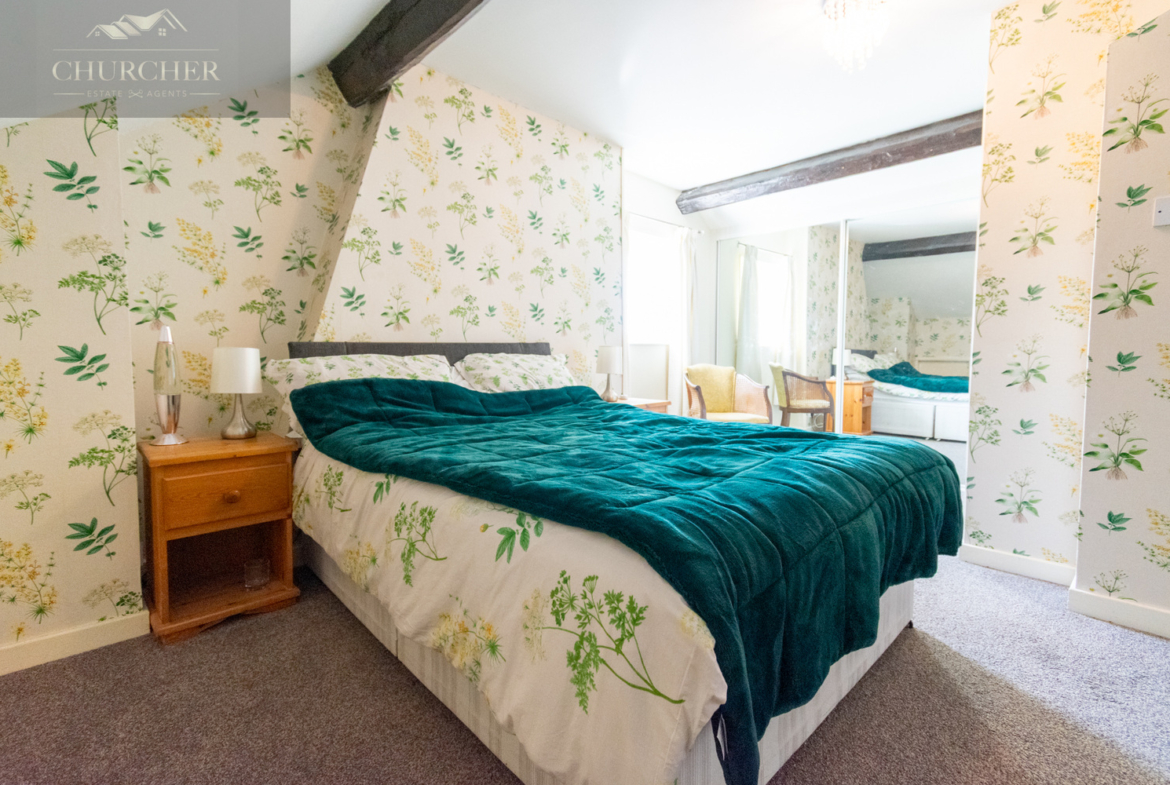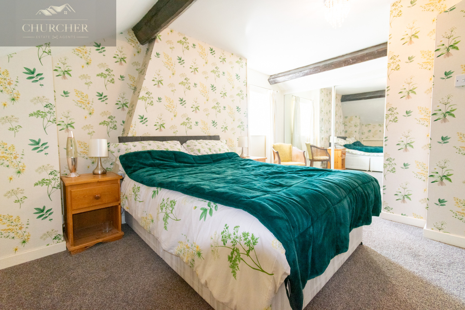 Bedroom Two also a substantial double, enjoys front facing views and benefits from a similar high-quality finish with built-in wardrobes, a matching dressing table, and storage furniture. This room also has access to a stylish newly fitted en-suite bathroom fitted with a panelled bath and mains shower over, a glass screen, pedestal basin, and WC. Finished with tiled walls and flooring, and featuring a charming, exposed beam ceiling, it offers a perfect blend of farmhouse character and modern comfort.