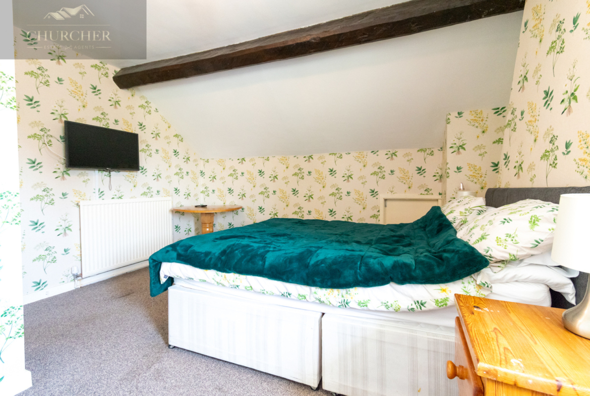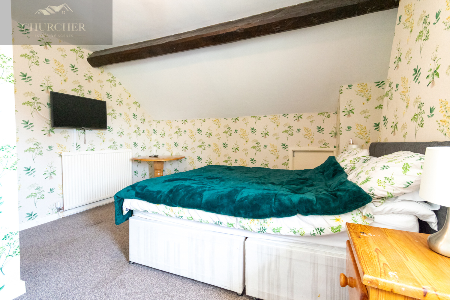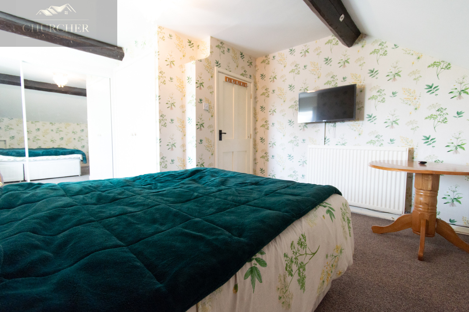 Bedroom Two also a substantial double, enjoys front facing views and benefits from a similar high-quality finish with built-in wardrobes, a matching dressing table, and storage furniture. This room also has access to a stylish newly fitted en-suite bathroom fitted with a panelled bath and mains shower over, a glass screen, pedestal basin, and WC. Finished with tiled walls and flooring, and featuring a charming, exposed beam ceiling, it offers a perfect blend of farmhouse character and modern comfort.