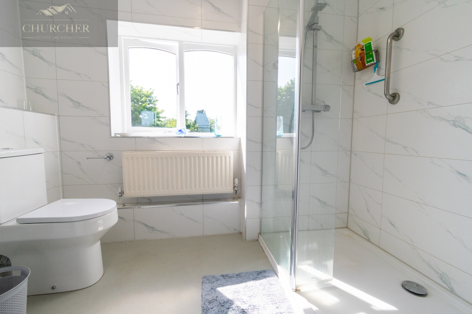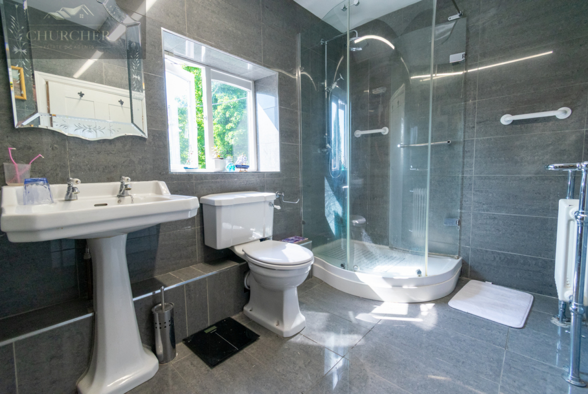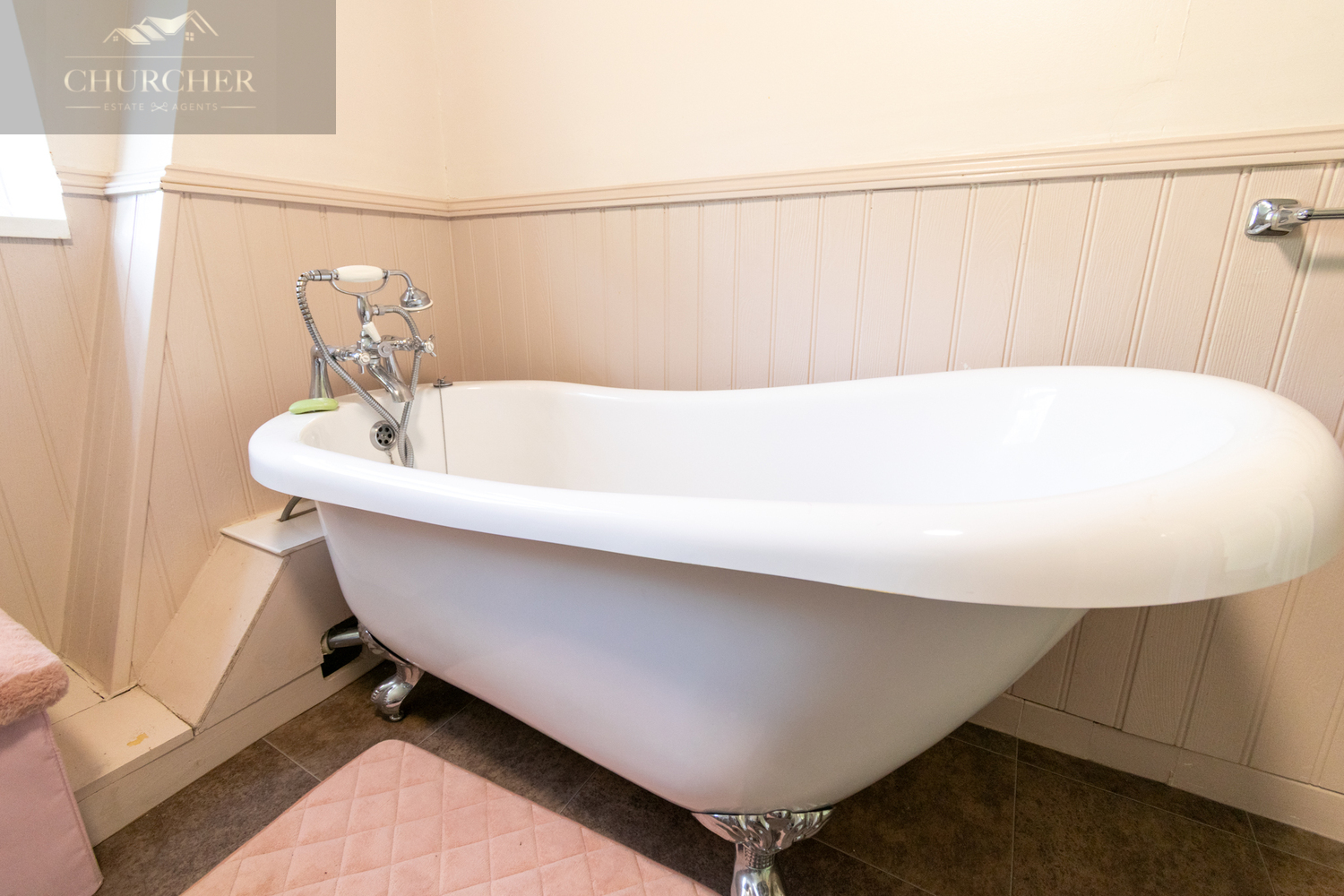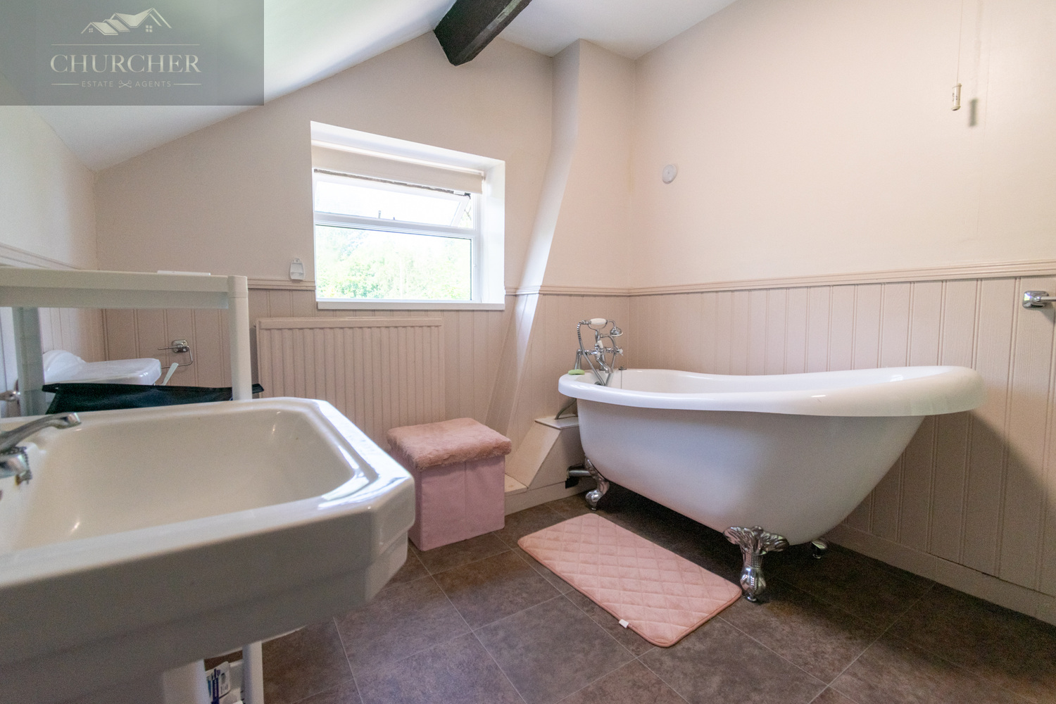 These upper bedrooms are served by a generous family bathroom, thoughtfully designed with a four-piece suite that includes a freestanding clawfoot roll-top bath with shower attachment, a separate tiled shower enclosure with an electric shower, WC, and a pedestal hand basin. Traditional tongue and groove wall panelling and soft vinyl flooring complete the