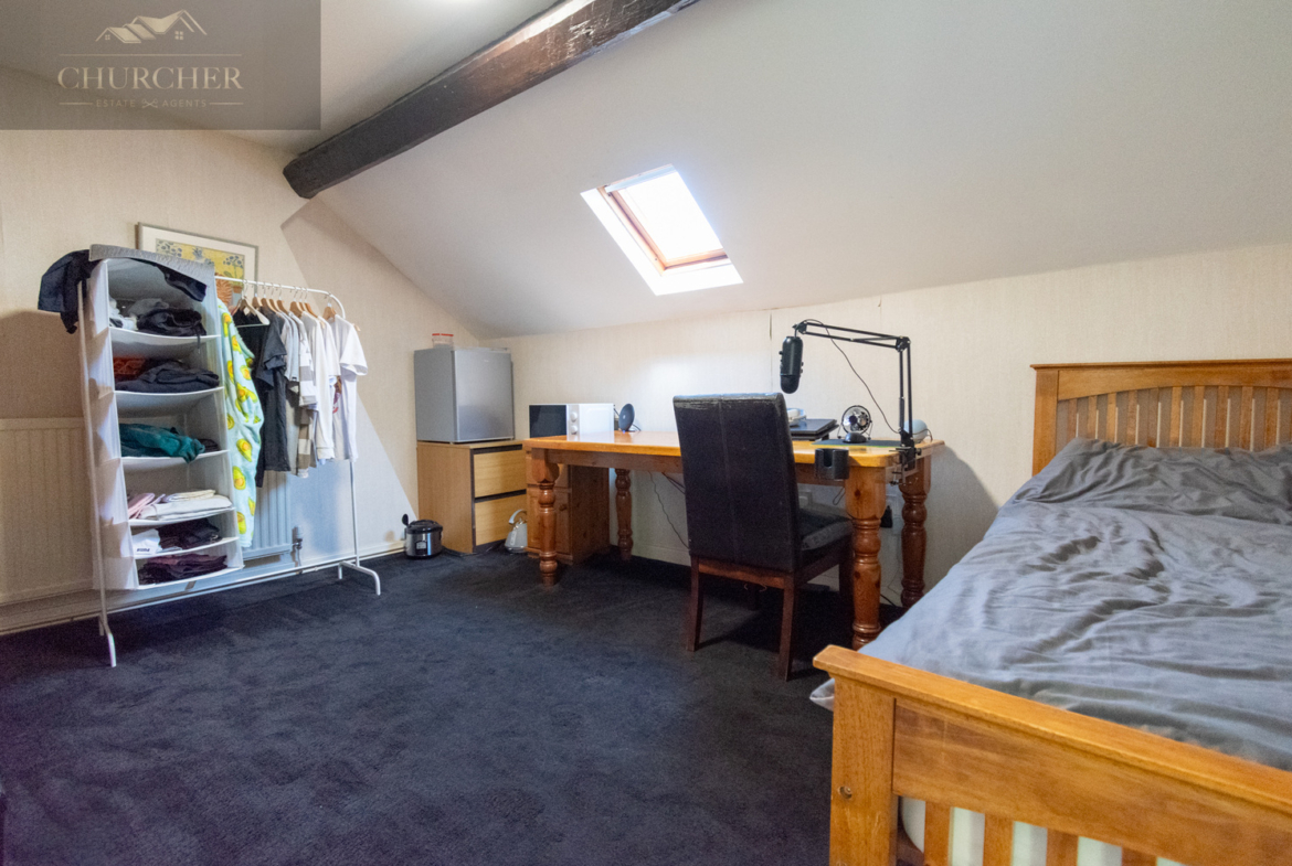 A wide staircase continues to the second floor where two further double bedrooms await, offering ideal accommodation for children, guests, or extended family. Bedroom Three is a bright and well-proportioned space with a side-aspect window, built-in mirrored wardrobes, and access to useful under-eaves storage. Bedroom Four is equally inviting, featuring a vaulted ceiling with exposed beams, a Velux window providing ample natural light, and under-eaves storage. The character and warmth of this room make it ideal as a guest room, creative studio, or additional family bedroom.
