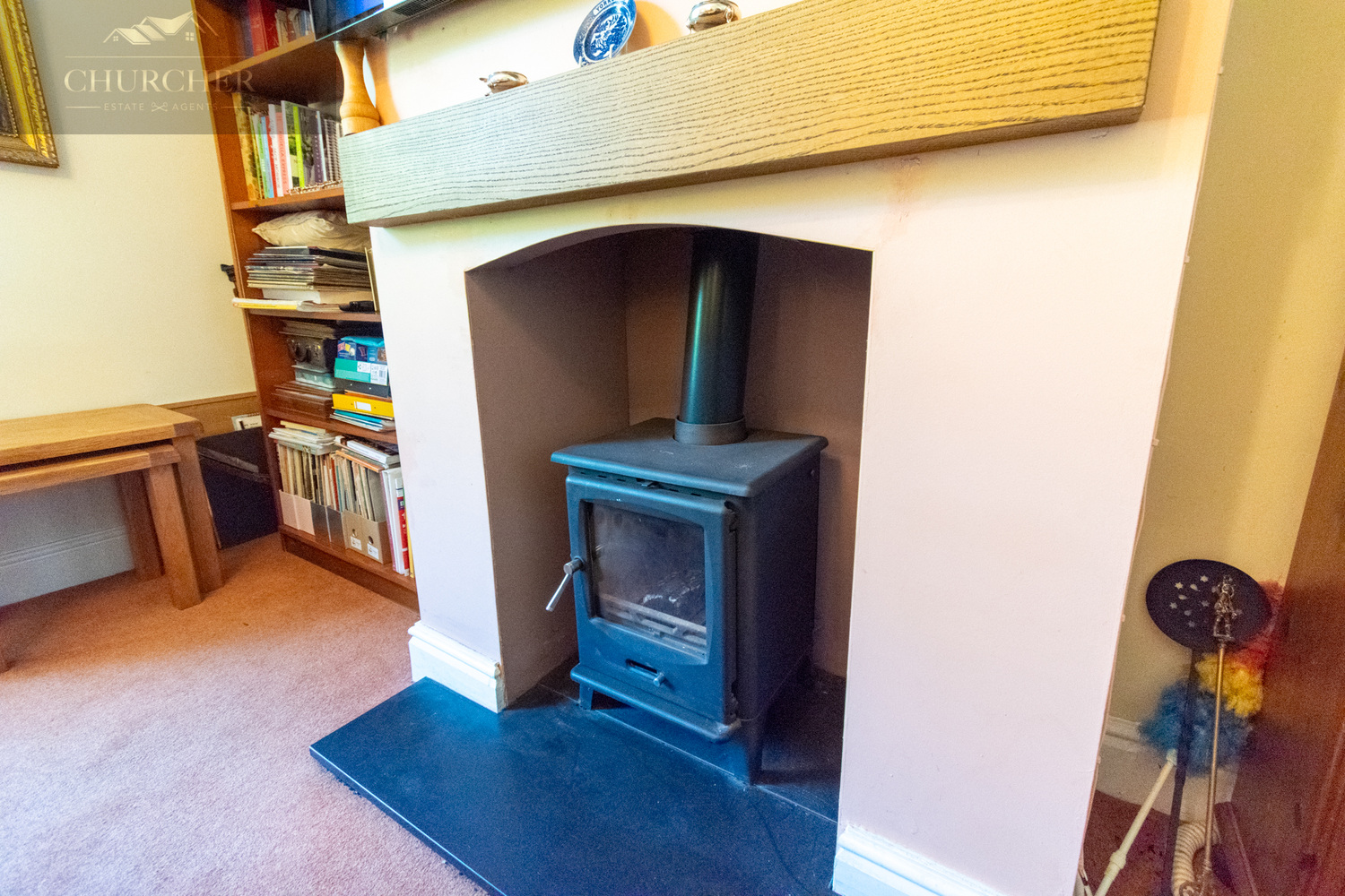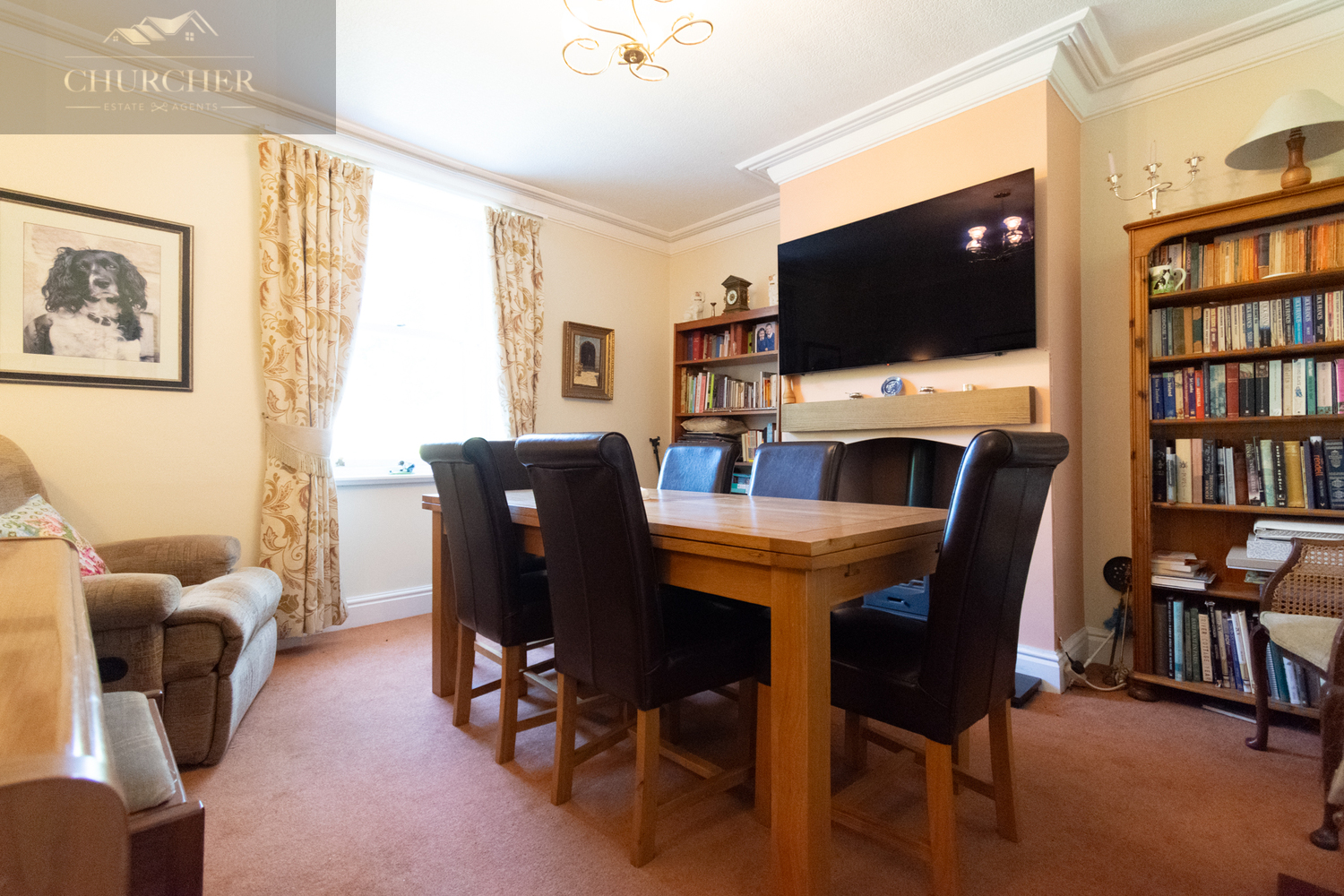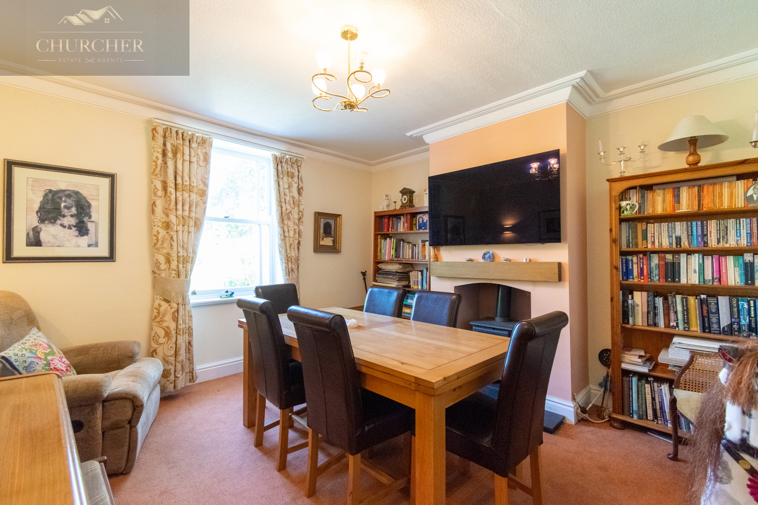 Adjacent to the lounge lies the dining/sitting room – a versatile and beautifully proportioned space that can adapt effortlessly to the needs of modern family life. Whether used as a formal dining room, a second living area, or an elegant entertaining space, this room offers both warmth and sophistication in equal measure. The high ceiling, complemented by original cornicing and a decorative ceiling rose, enhances the sense of historic comfort, while a central pendant light adds a soft, ambient glow in the evenings.