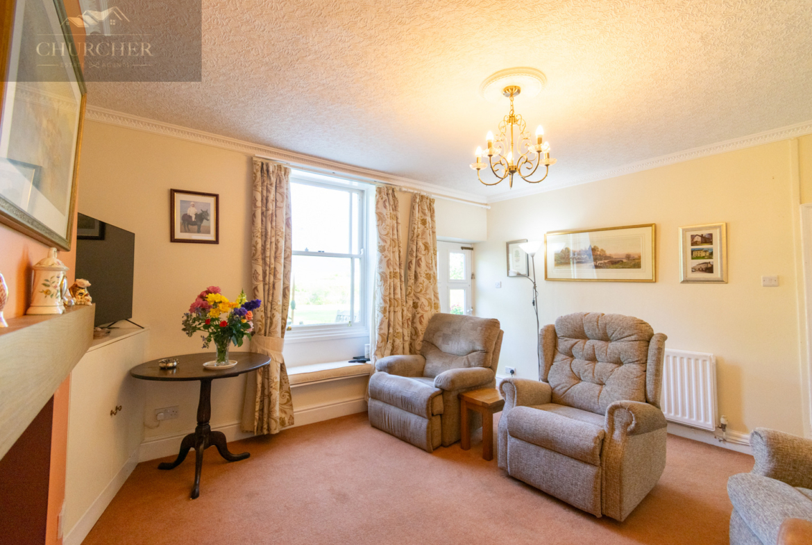 Across from the kitchen you will find the principal lounge; an inviting and elegantly styled space that perfectly reflects the property’s rich character and timeless charm. Framed by deep skirting boards and finished in soft neutral tones, this spacious room centres around a striking fireplace, complete with a solid wood mantle and a cosy log-burning stove – a true focal point that radiates warmth and comfort throughout the seasons. Natural light pours in through a large sash-style window, accentuating the classic décor and casting a gentle glow across the room. Subtle cornicing, a ceiling rose, and a statement chandelier add a touch of refined farmhouse elegance, while plush carpeting and warm ambient lighting make this an ideal room in which to relax and unwind. The front door of the property is also a charming feature of this room.