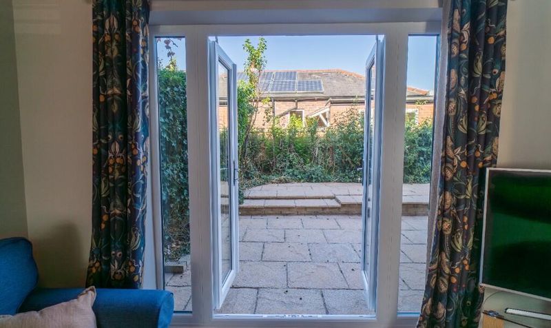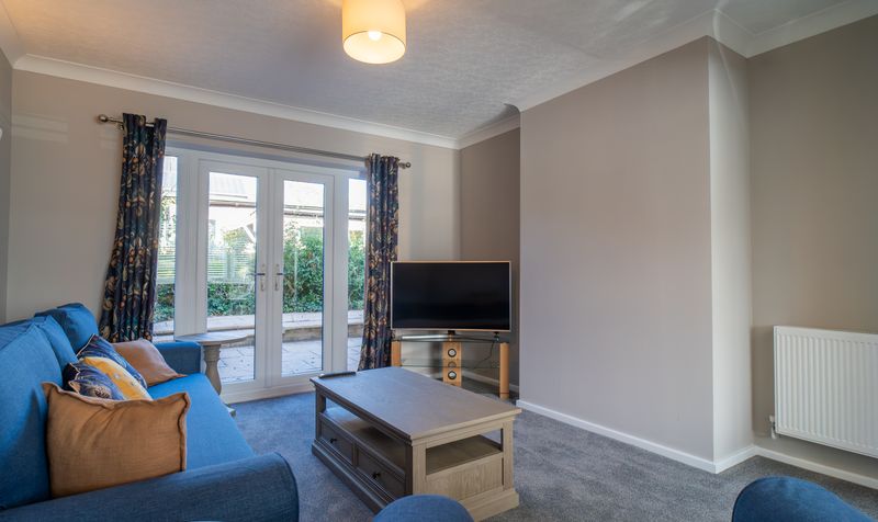 To the rear of the ground floor is the wonderfully spacious lounge-an inviting, comfortable setting complete with a king-size sofa bed, tasteful textiles, and a large TV for leisurely evenings. French doors lead directly out to the rear patio, allowing the room to be flooded with sunlight while seamlessly merging indoor and outdoor living. The view of the private garden beyond offers tranquillity and the perfect spot to unwind after a day at The Open.