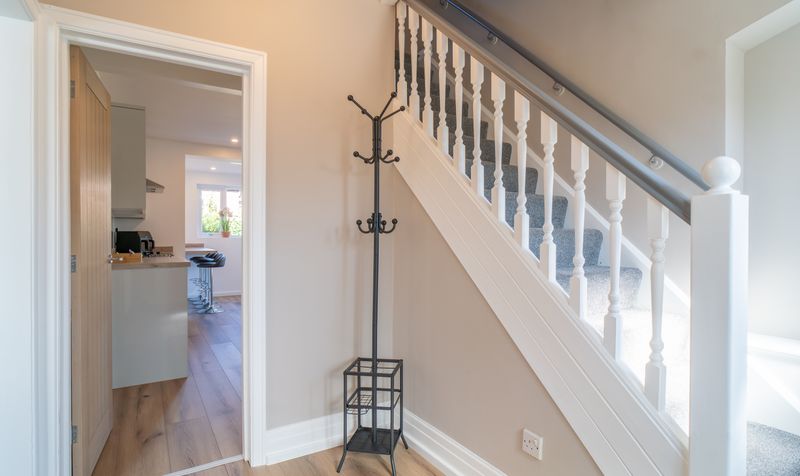 Set behind an attractive frontage with bay windows and manicured shrubs, the property welcomes you into a bright and inviting entrance hallway. Soft neutral décor, warm timber-style flooring, and a contemporary staircase create an immediate sense of calm, setting the tone for the refined accommodation beyond. From here, the hallway flows naturally into the heart of the home.