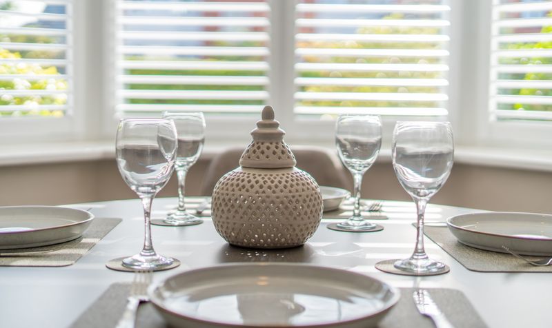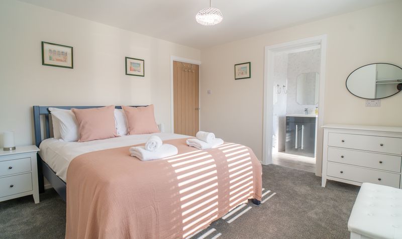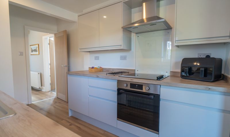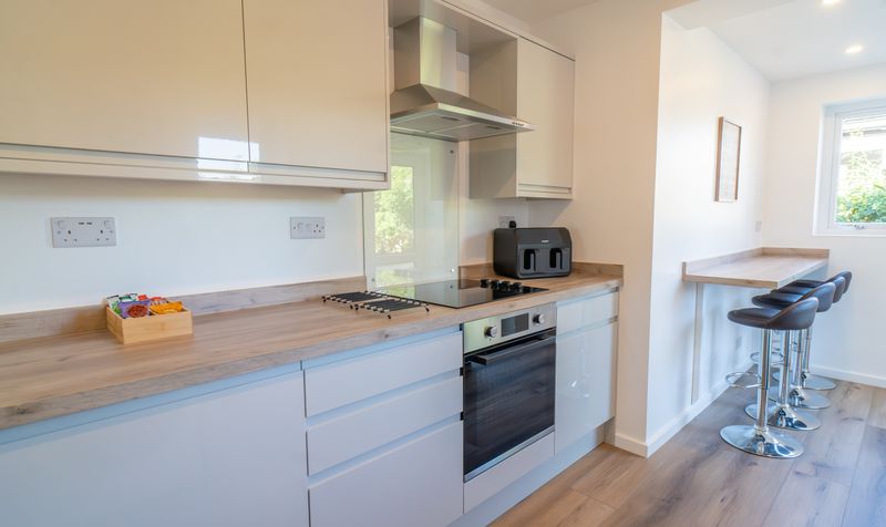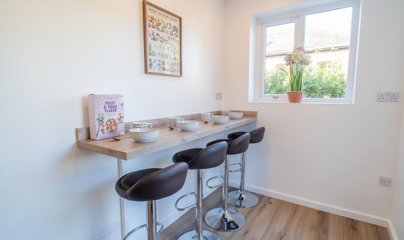 The kitchen has been finished to an exceptional standard, combining modern design with everyday practicality. High-gloss cabinetry, integrated appliances, and generous worktops complement the sleek aesthetic, while multiple windows bathe the room in natural light. A dedicated breakfast bar offers a perfect spot to start the day, with views across the garden. Thoughtful touches-such as elegant tableware, feature artwork, and a welcoming bottle of Prosecco-add a boutique feel synonymous with high-end holiday living.