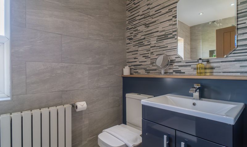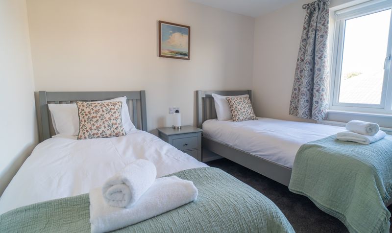 The second bedroom is equally inviting, featuring two comfortable single beds dressed in fresh coastal tones, making it perfect for friends, visiting colleagues, or younger guests. The main bathroom on this level mirrors the same standard of luxury, with modern grey tiling, a spacious walk-in shower, and high-quality fixtures throughout.