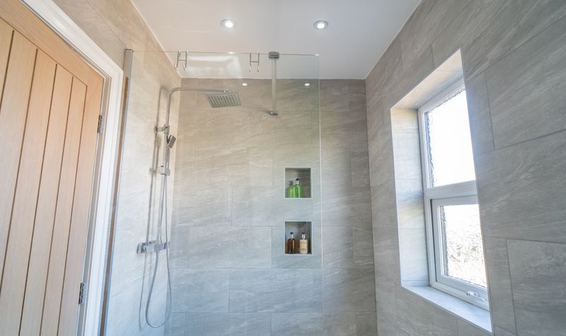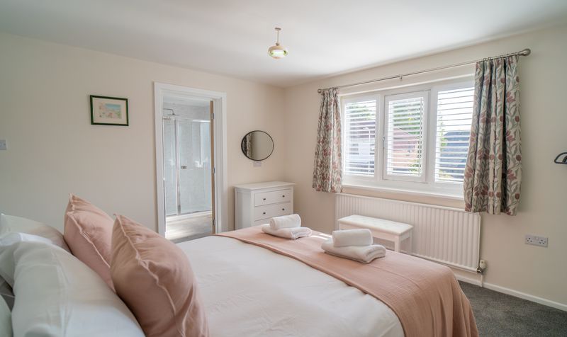 Upstairs, the property continues to impress with two exceptionally presented bedrooms. The main bedroom offers a king-size bed dressed in soft blush tones, complemented by large windows with plantation shutters framing leafy residential views. The sense of space and serenity is ideal for guests seeking restful nights during tournament week. Leading directly from the main bedroom is a contemporary en-suite shower room, beautifully appointed with sleek tiling, a rainfall shower, inset shelving, and a stylish vanity.