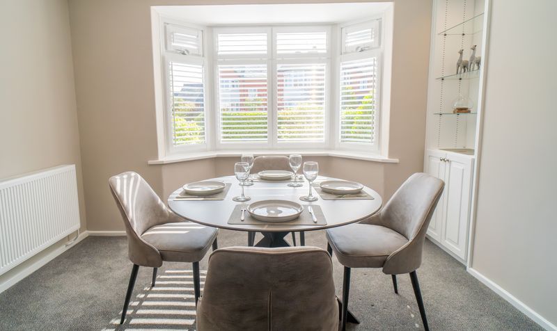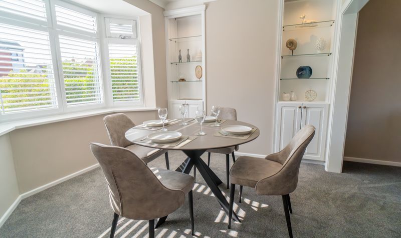 Beyond the kitchen sits the stylish dining room, set within the light of a beautiful front bay window. The room is elegantly furnished with a modern dining suite and built-in lit display cabinets, creating the perfect space for relaxed evening meals or entertaining guests. The continuity of décor and the soft palette throughout ensure each room flows effortlessly into the next.