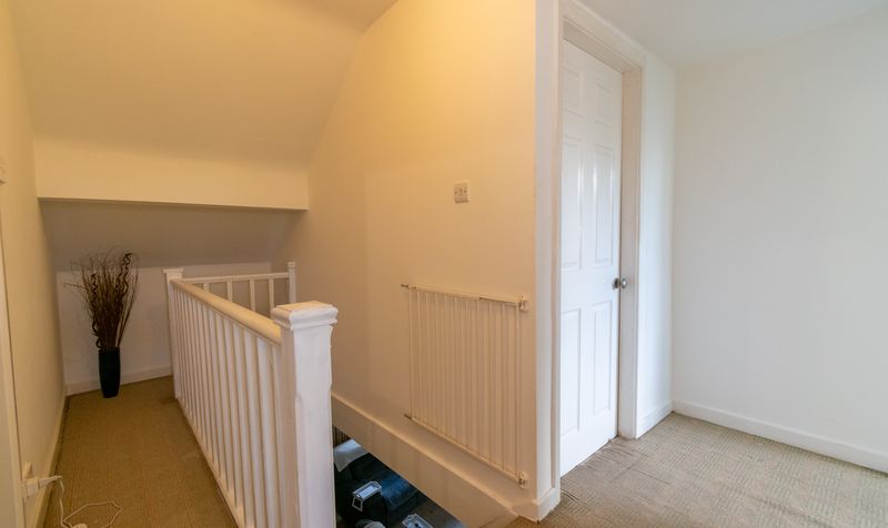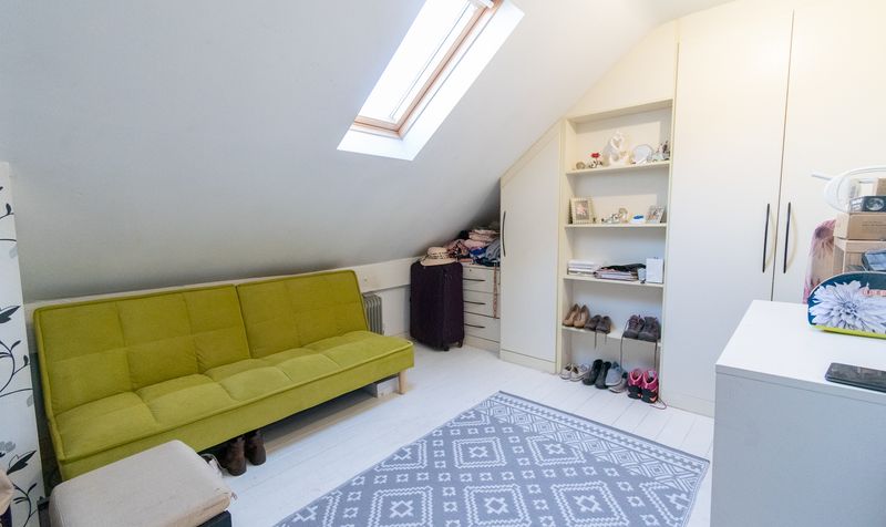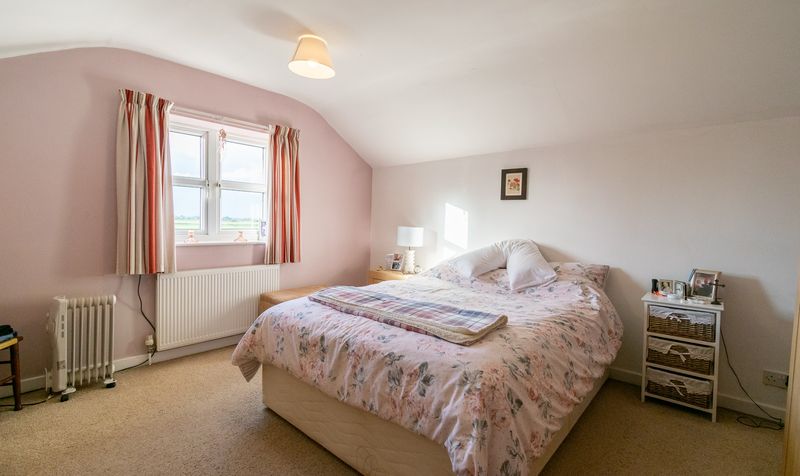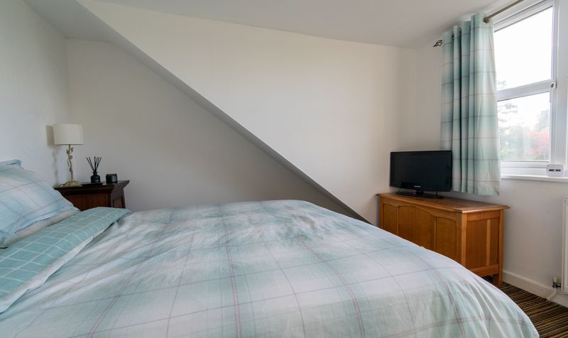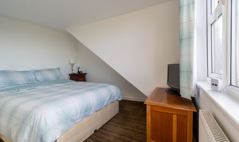 Upstairs in the annex, the double bedroom offers a peaceful retreat, finished in soft tones with a pitched ceiling, window overlooking the rear, and ample floor space for wardrobes or dressers.