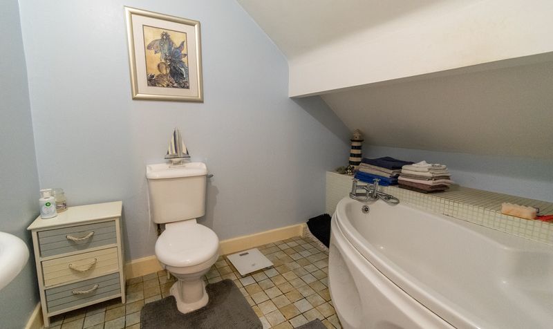 Upstairs in the main house, three generously proportioned bedrooms are arranged around a central landing, each finished in calming neutral tones. The main bathroom is bright and practical, featuring a white three-piece suite with bathtub and pedestal sink.