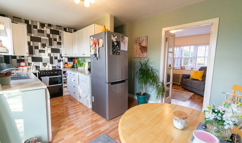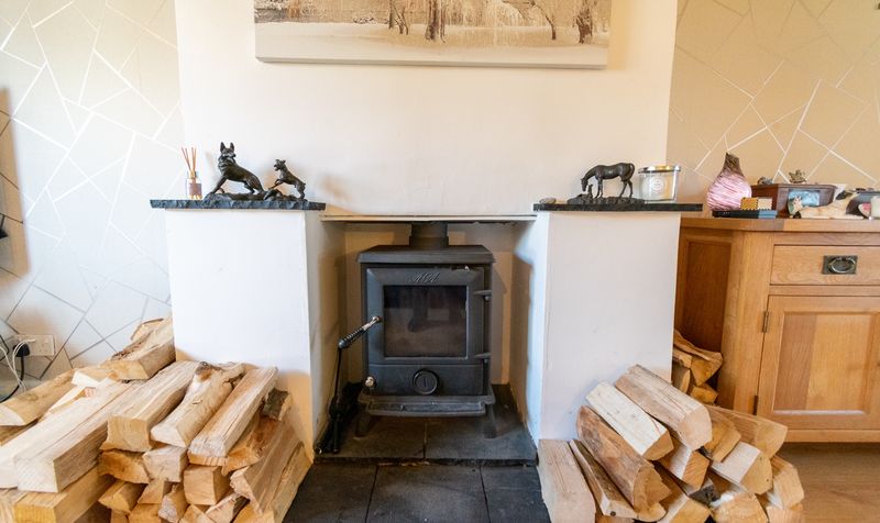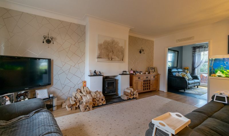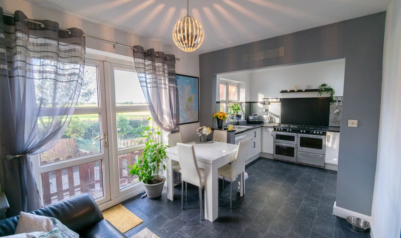 Upon arrival, the home impresses immediately with its smart frontage, ample off-road parking and low-maintenance gravel driveway. Stepping inside via the modern timber entrance door, you are welcomed into a spacious entrance porch that opens into the main lounge-an expansive and light-filled space featuring a large picture window overlooking the front garden. A contemporary neutral colour scheme, feature fireplace with log-burning stove, and open staircase give this room both character and comfort. The generous proportions offer ample room for a variety of furniture layouts, while the open sightline to the rear of the home invites you further in.