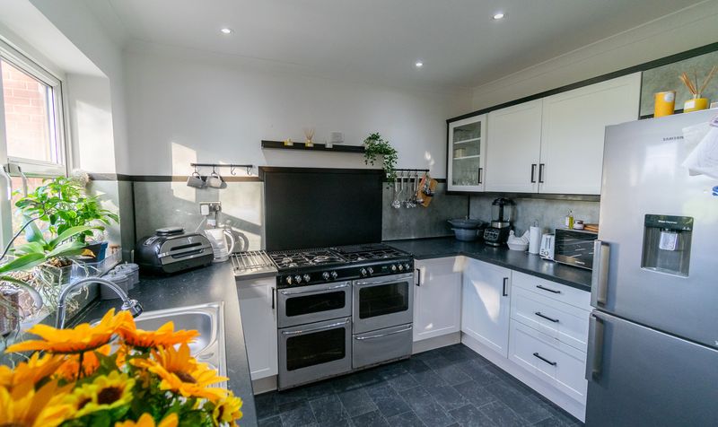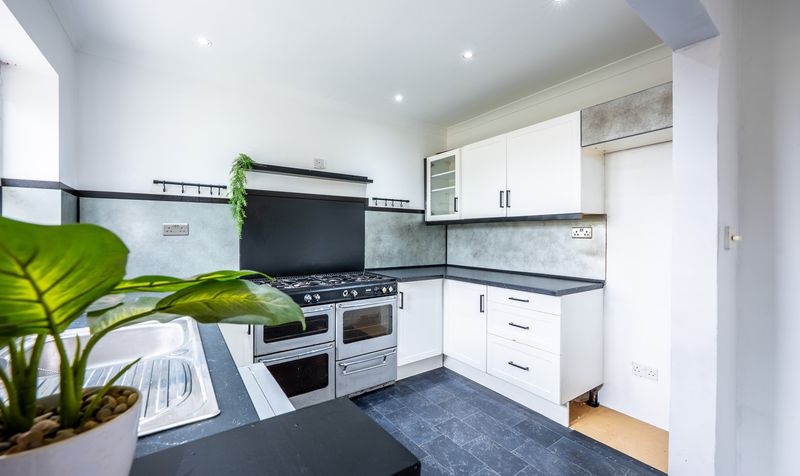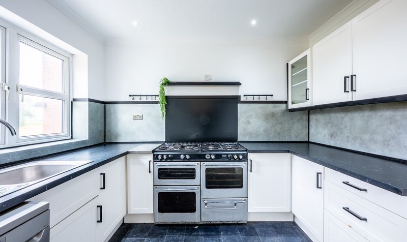 The main kitchen sits at the rear of the property and has been designed with both style and practicality in mind. Crisp white cabinetry is complemented by modern black hardware and dark countertops, while the large range-style cooker adds a professional touch. The U-shaped layout provides generous work surfaces and storage, and a window above the sink frames views of the surrounding greenery.