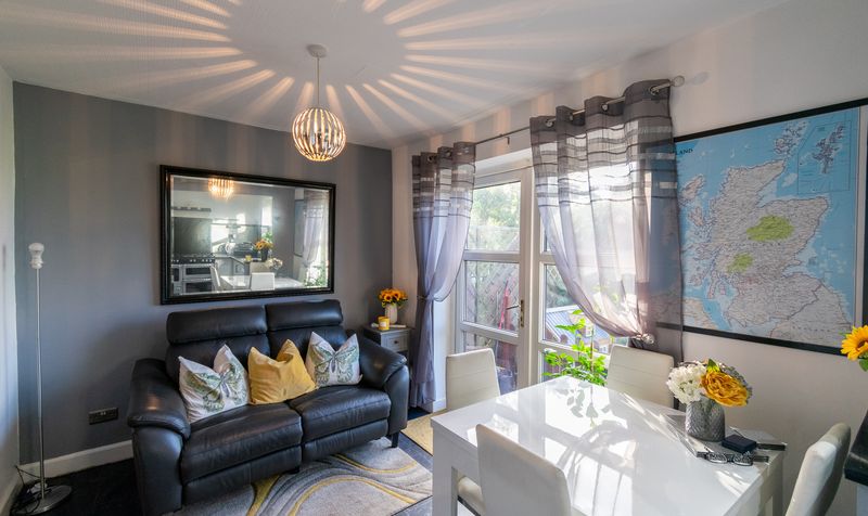 Flowing through the lounge, you will find the dining room at the back of the home, which enjoys direct garden access via a set of French doors. The room is beautifully styled with a bold feature wall, modern pendant lighting, and soft natural light pouring in, making it ideal for family meals or social occasions.
