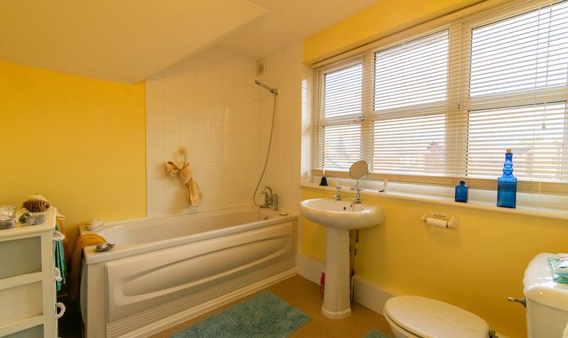 The annex bathroom, located adjacent to the bedroom, features a traditional three-piece suite with a full-sized bathtub, pedestal sink and WC, set against cheerful yellow walls and a large window allowing plenty of natural light to fill the space.