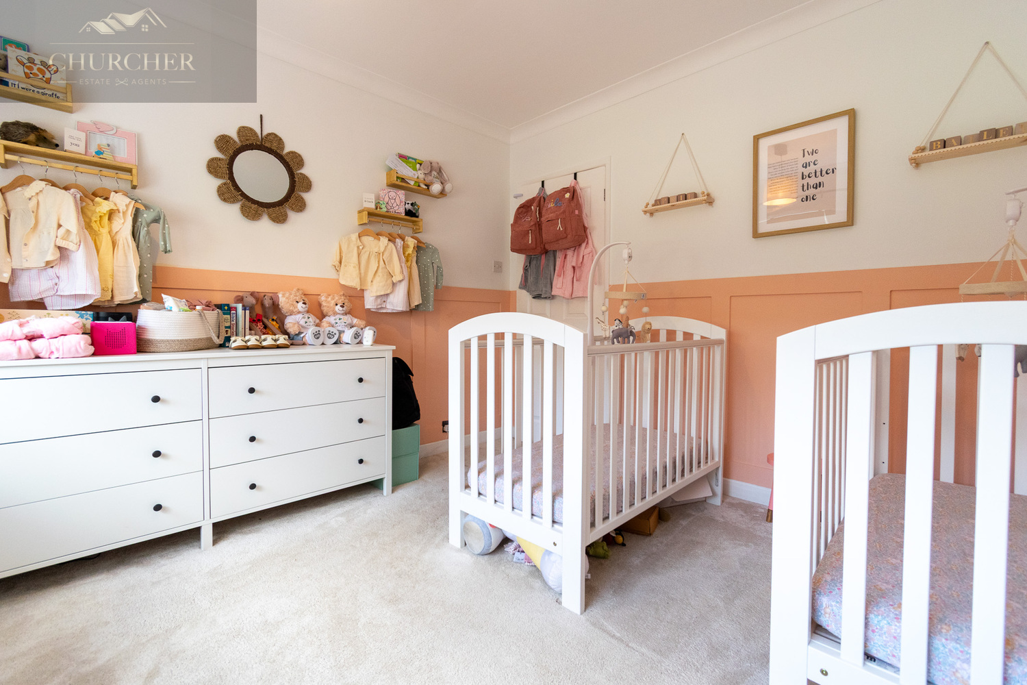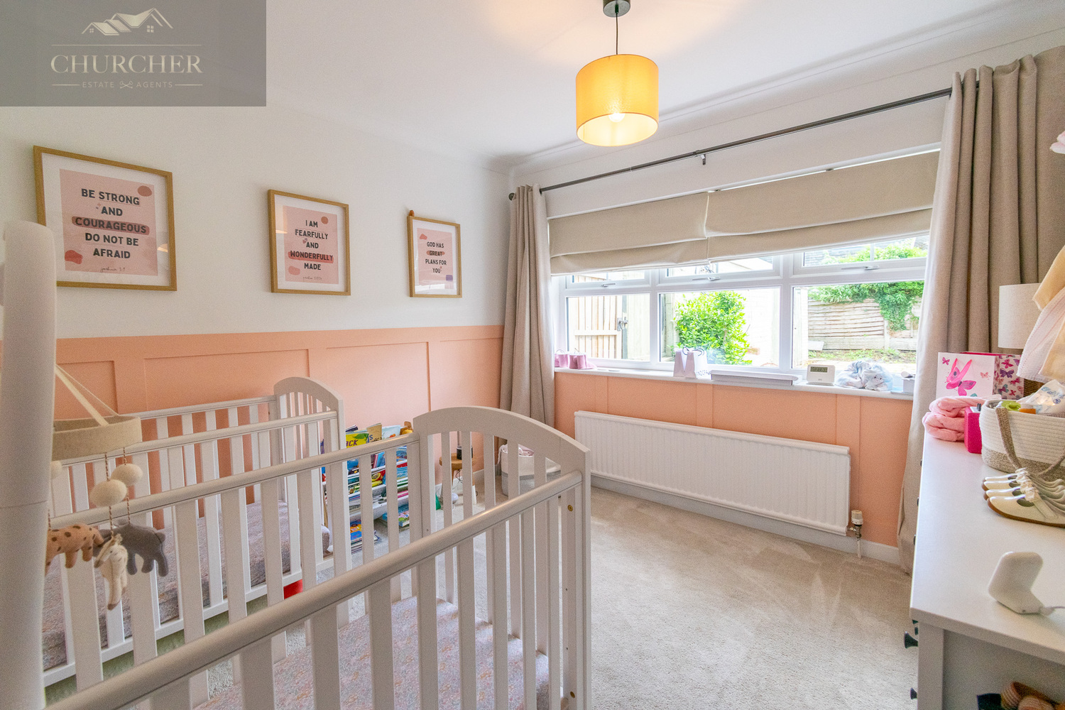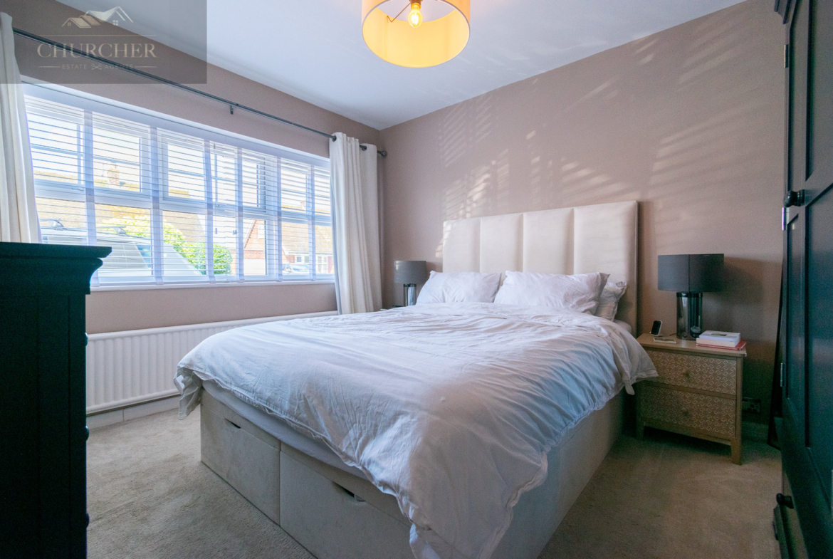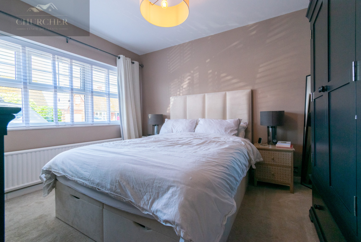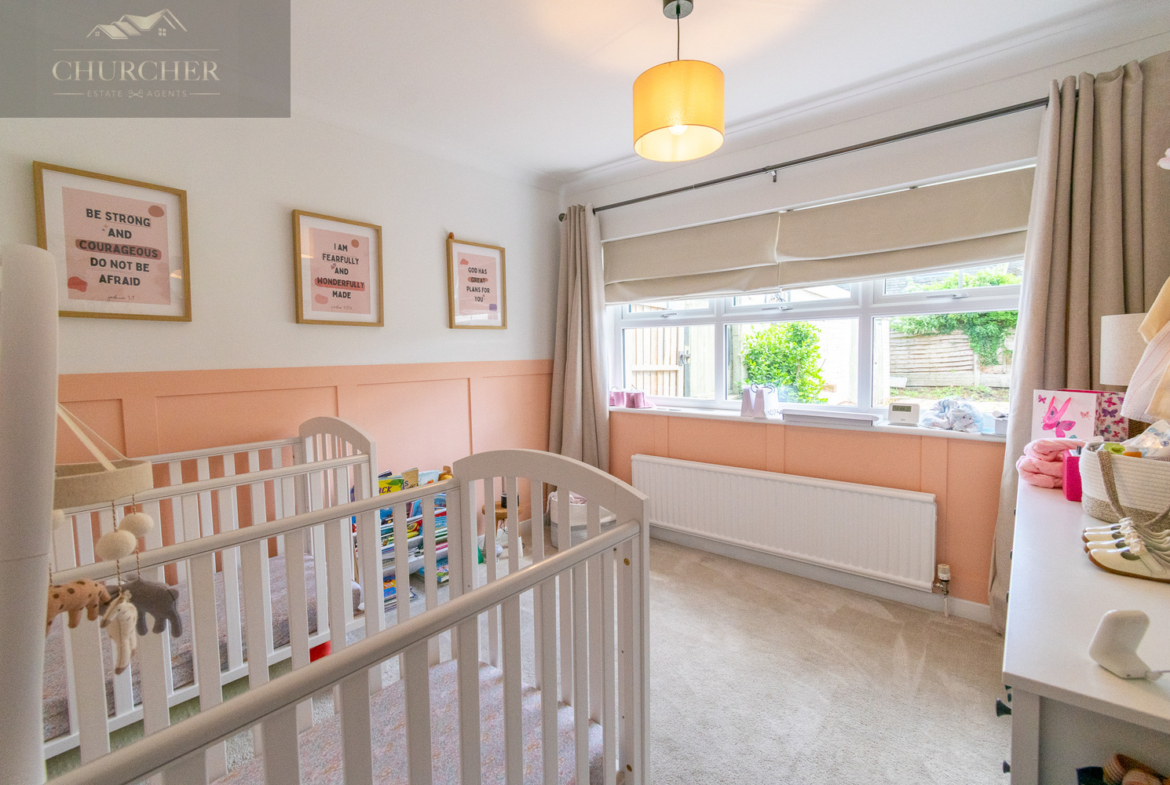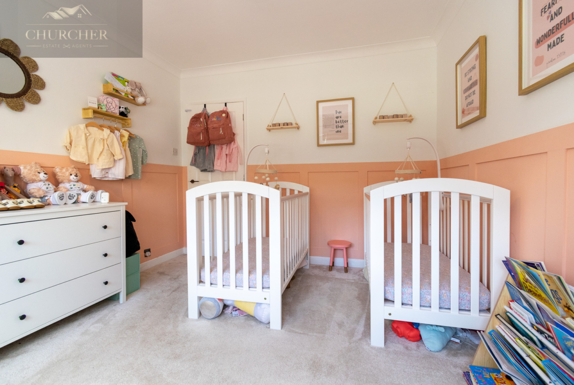 Also located on the ground floor are two well-proportioned bedrooms, both presented in calming, neutral tones. The principal bedroom is a tranquil and elegantly presented space, designed with relaxation in mind. Soft wall colours are complemented by plush carpeting underfoot, creating a warm and restful atmosphere. A large window spans the front wall, allowing an abundance of natural light to flood the room while offering a lovely view over the front garden and street beyond. The second bedroom, currently used as a nursery, offers flexibility for use as a guest bedroom, playroom, or additional office space.