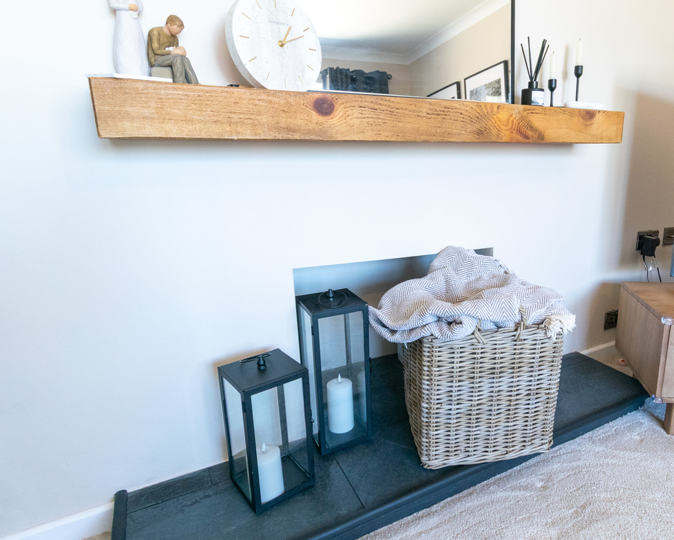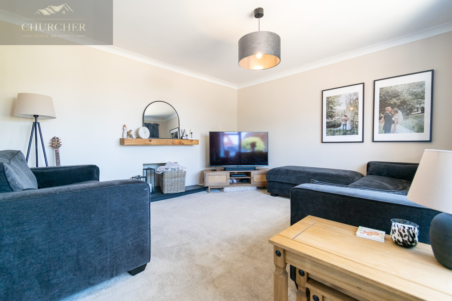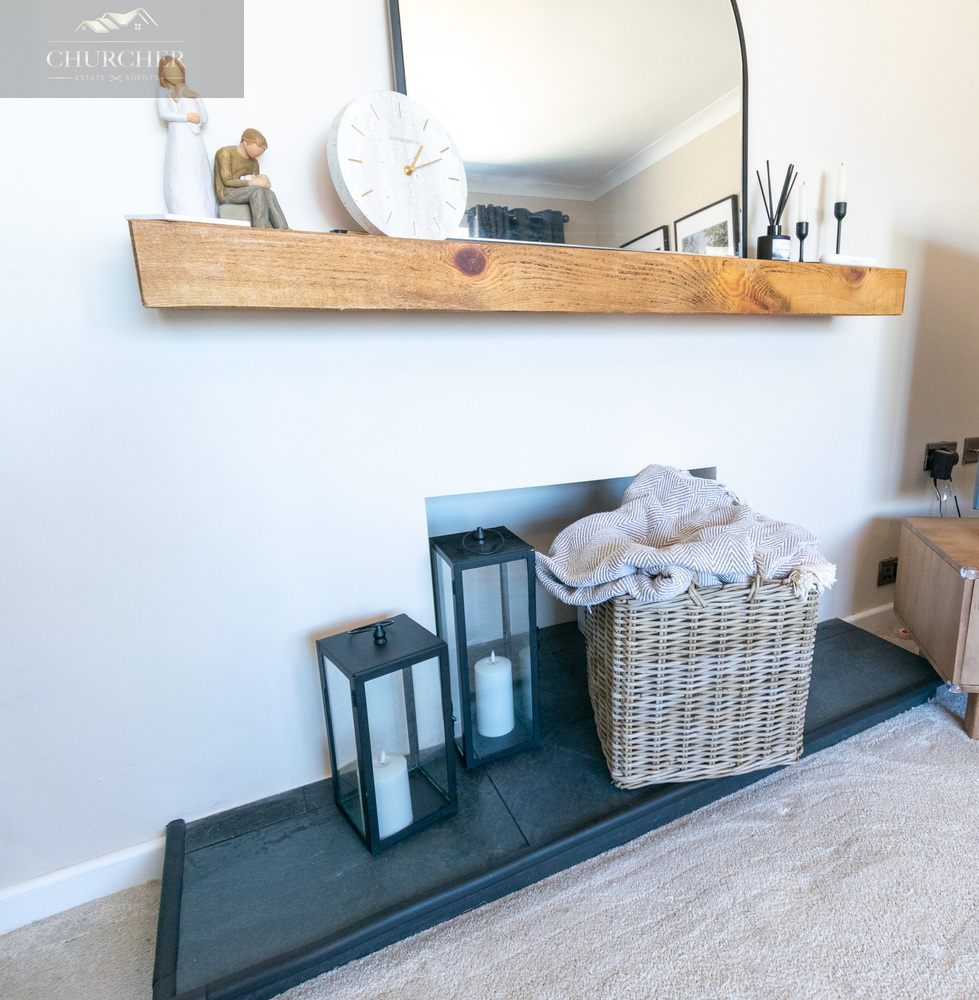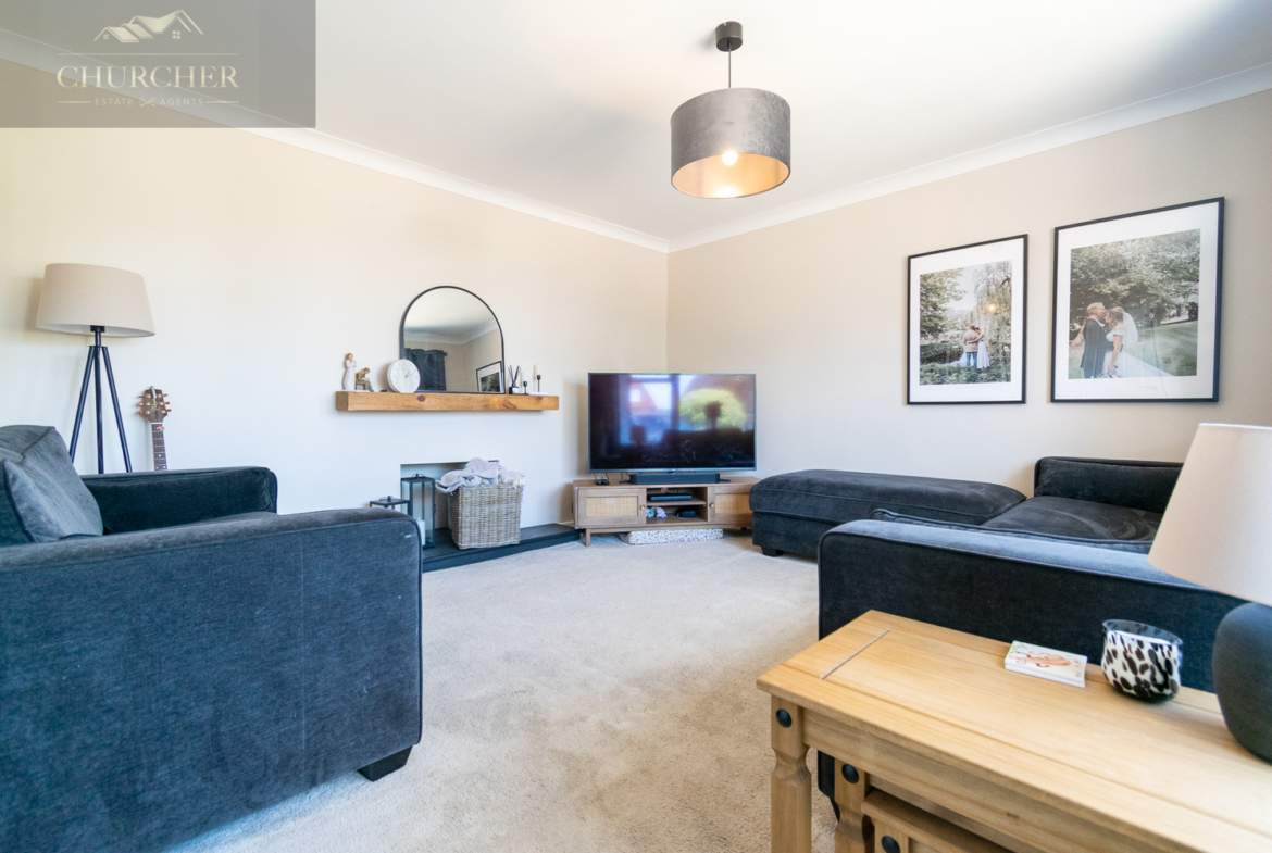 To the front of the property sits a beautifully appointed lounge, flooded with natural light via a wide bay window. The space is cosy yet spacious, enhanced by plush carpeting, soft tones, and a feature fireplace niche that provides a stylish focal point.