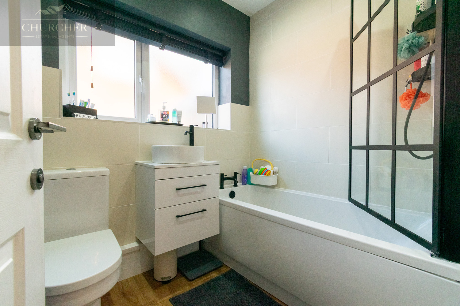 The stylishly upgraded family bathroom completes this level, featuring a modern floating vanity unit with countertop basin, back-to-wall WC, panelled bath with black-framed screen and shower over, and chic black fixtures throughout.