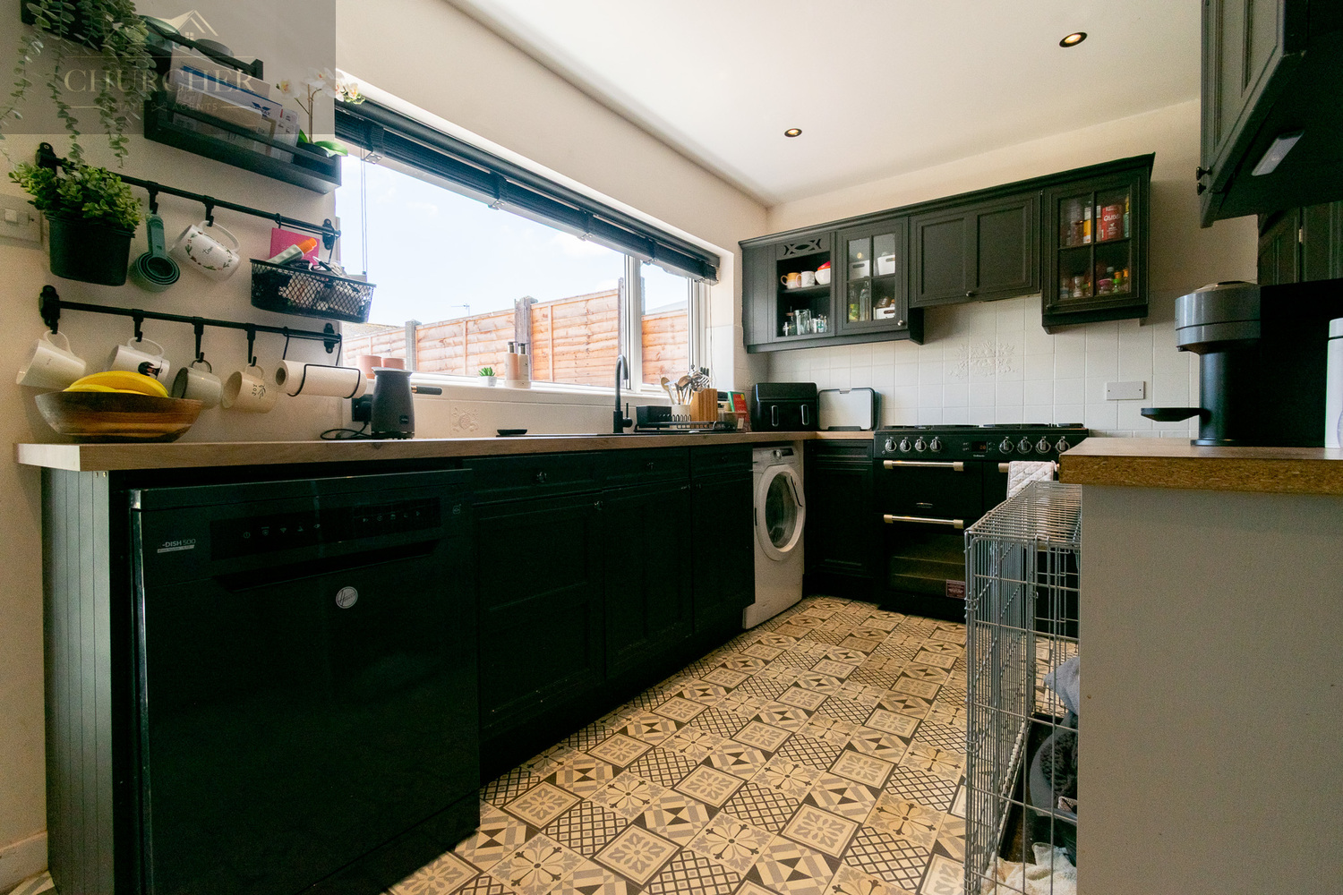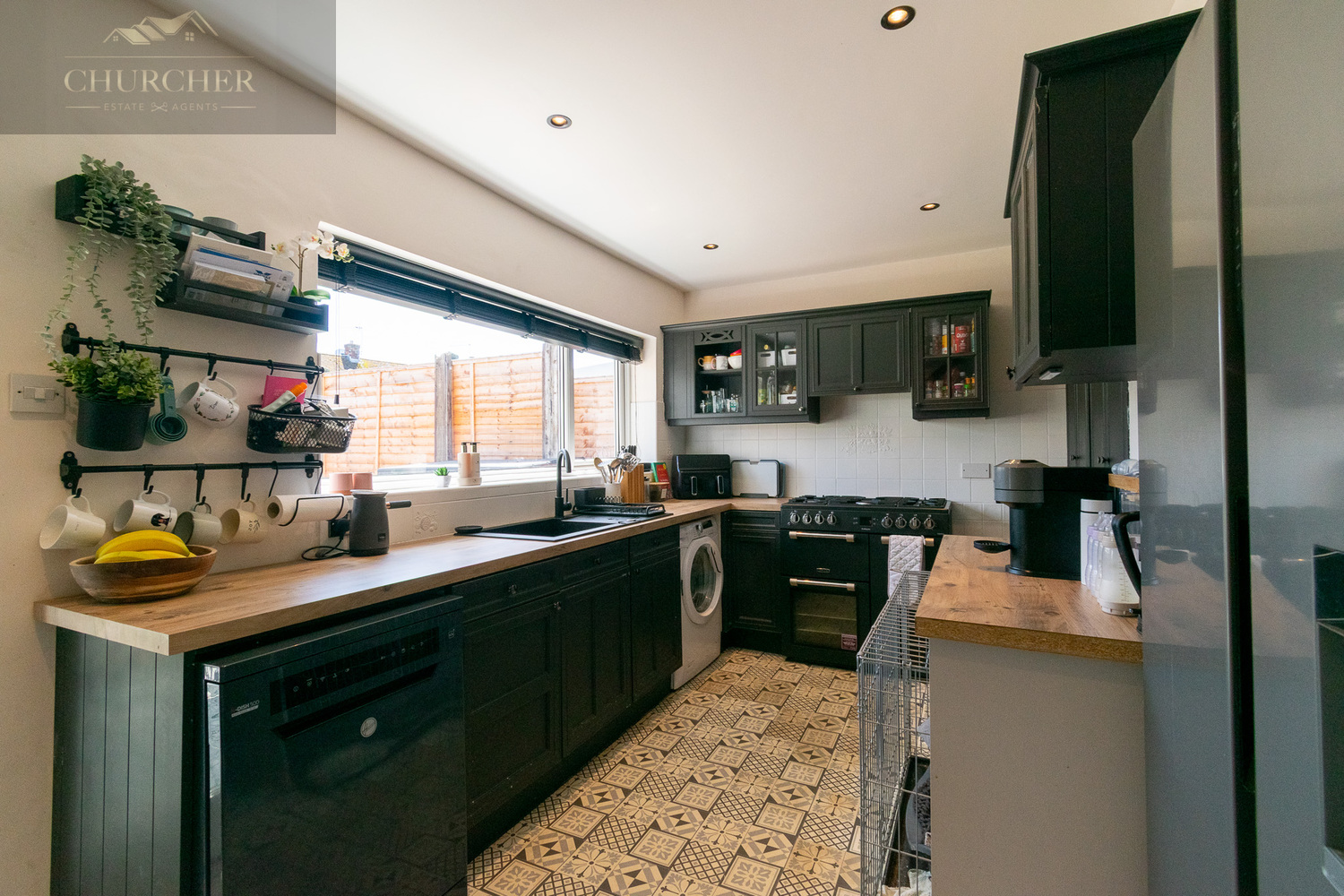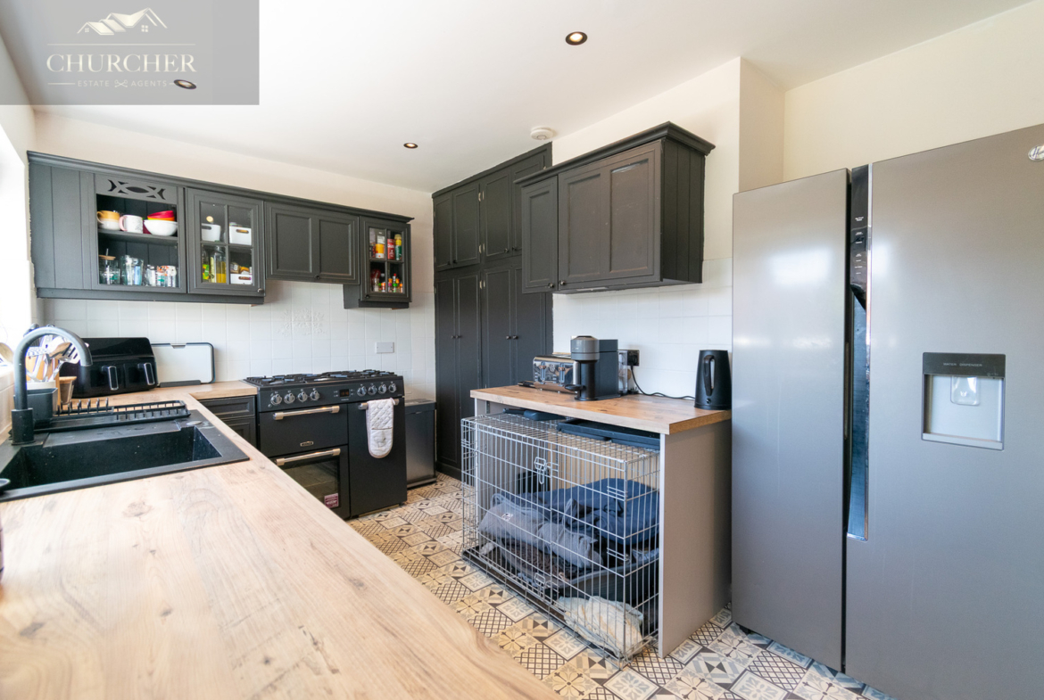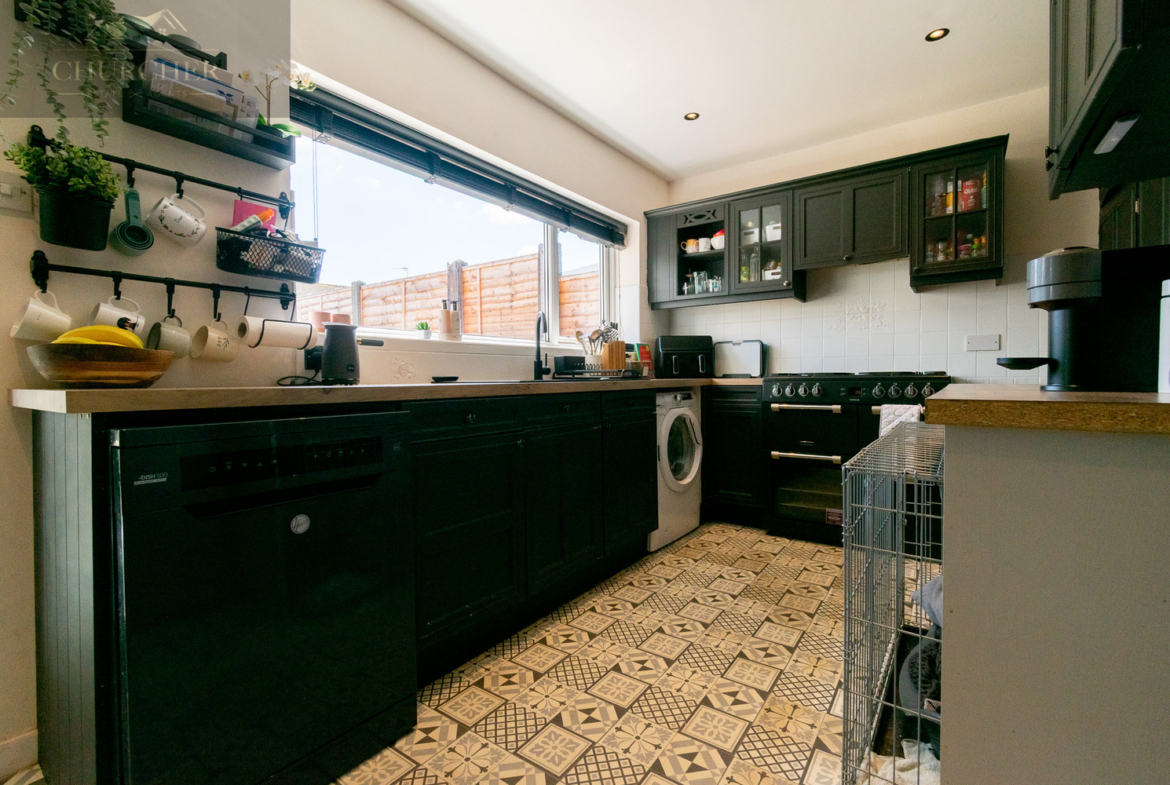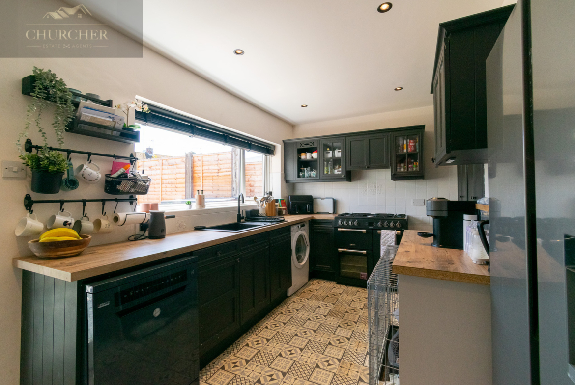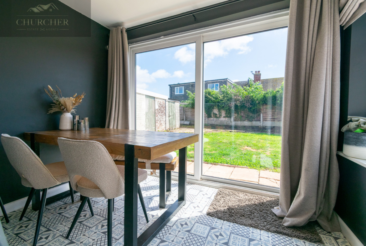 Moving through the hallway, you reach the contemporary kitchen, fitted with dark shaker-style cabinetry, sleek worktops, and a composite sink. The room is as practical as it is stylish, with an abundance of space for appliances, open shelving, and generous work surfaces. A door leads into a bright dining area, where large patio doors frame views of the rear garden and invite the outside in. The patterned tiled flooring adds charm and character, making this space ideal for entertaining or enjoying family meals.