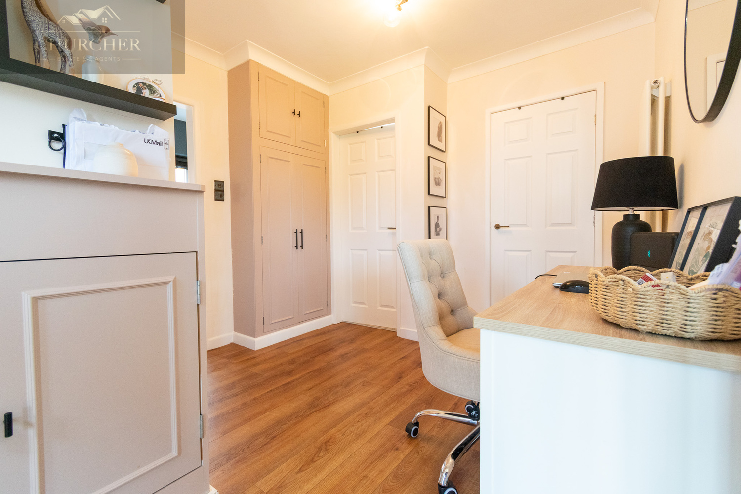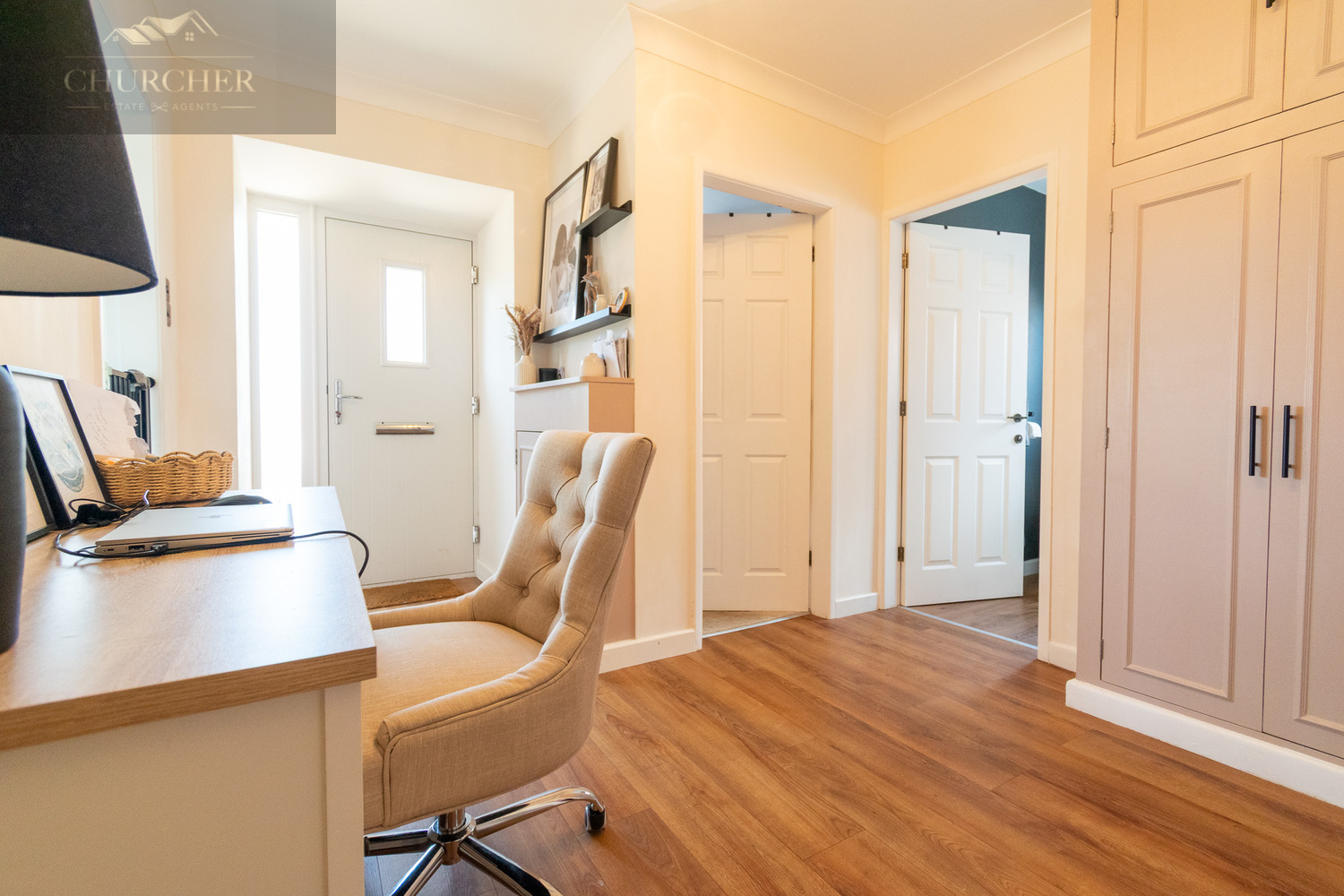 Upon entering the property, you are greeted by a bright and inviting hallway, finished with warm wood-effect flooring and neutral décor, setting the tone for the rest of the home. A thoughtfully incorporated home office area with built-in cabinetry and desk provides the perfect space for remote working, seamlessly blending into the layout without compromising flow or style.