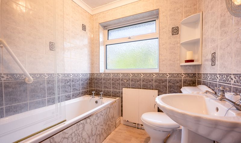 The family bathroom is on the larger side and features a three-piece suite including a panelled bath with overhead shower, pedestal wash basin, and WC. The walls are fully tiled in a complementary design, and a frosted window provides both privacy and light.