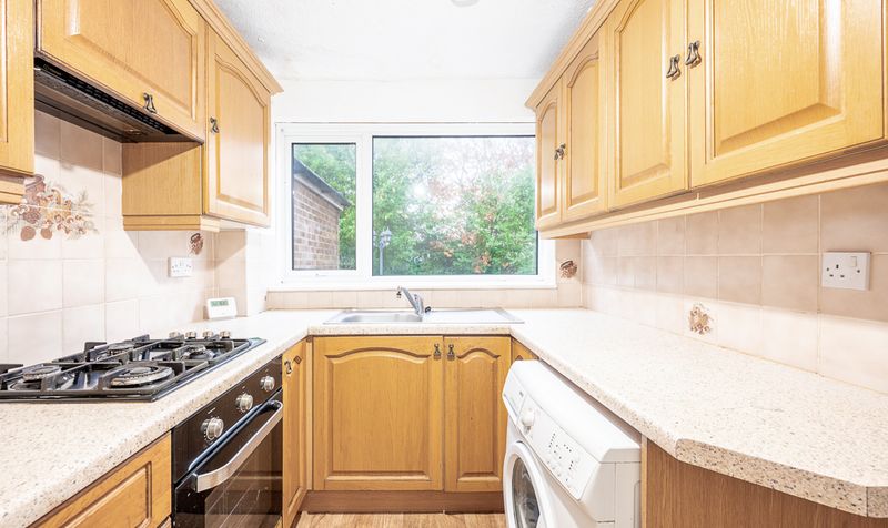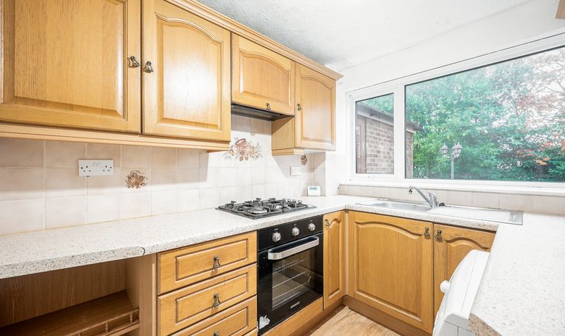 Upon entering at the side the property, you are greeted by a bright hallway that leads directly into the kitchen. The kitchen is fitted with a range of traditional wooden wall and base units complemented by modern worktops and tiled splashbacks. The large rear-facing window fills the space with natural light, while the wood-effect flooring gives the room a warm and modern feel.