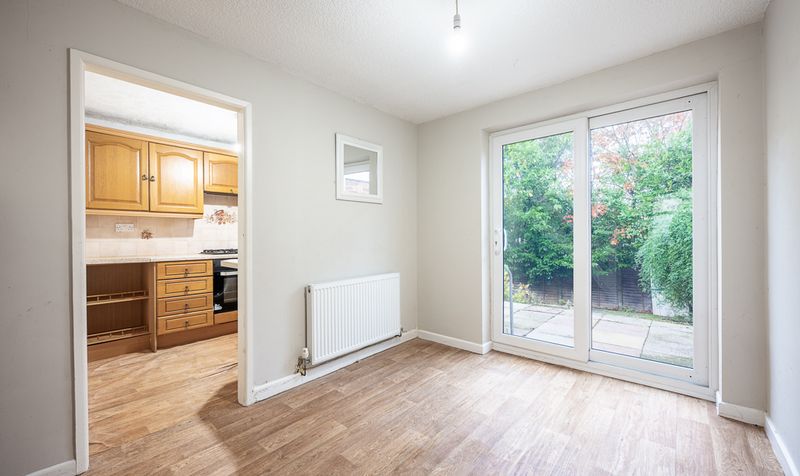 From the kitchen, a doorway leads through to the dining room – a lovely, versatile space ideal for family meals or entertaining guests. The dining area continues with the same stylish wood-effect flooring and features patio doors opening out onto the rear garden, allowing light to flood the space. The staircase rises neatly from this room to the first floor, adding character and a practical layout to the home.