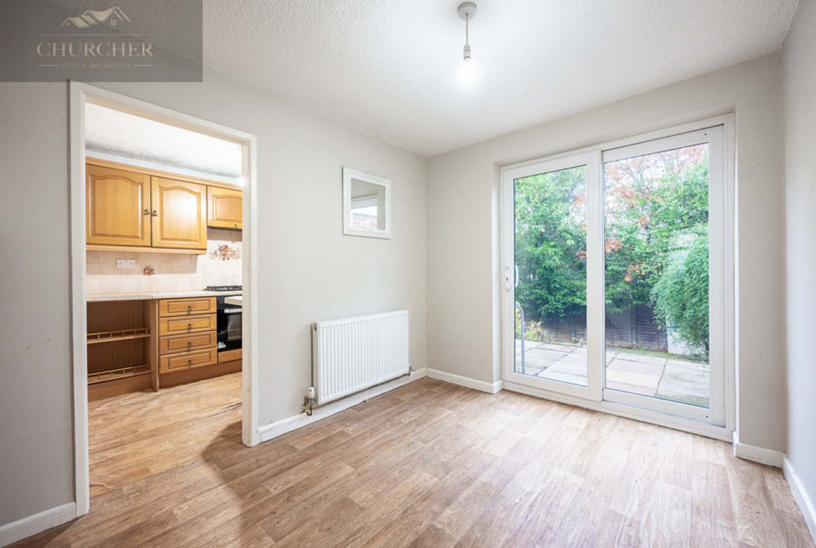 From the kitchen, a doorway leads through to the dining room – a lovely, versatile space ideal for family meals or entertaining guests. The dining area continues with the same stylish wood-effect flooring and features patio doors opening out onto the rear garden, allowing light to flood the space. The staircase rises neatly from this room to the first floor, adding character and a practical layout to the home.