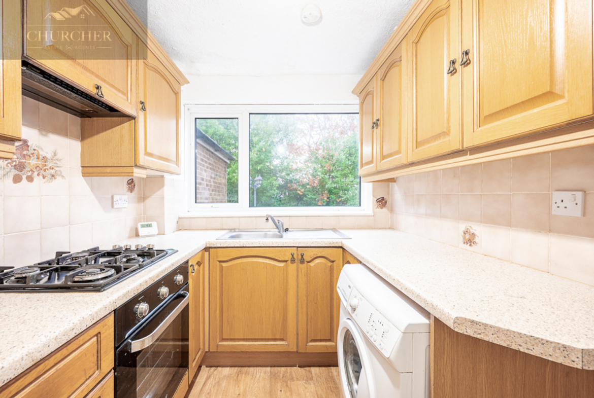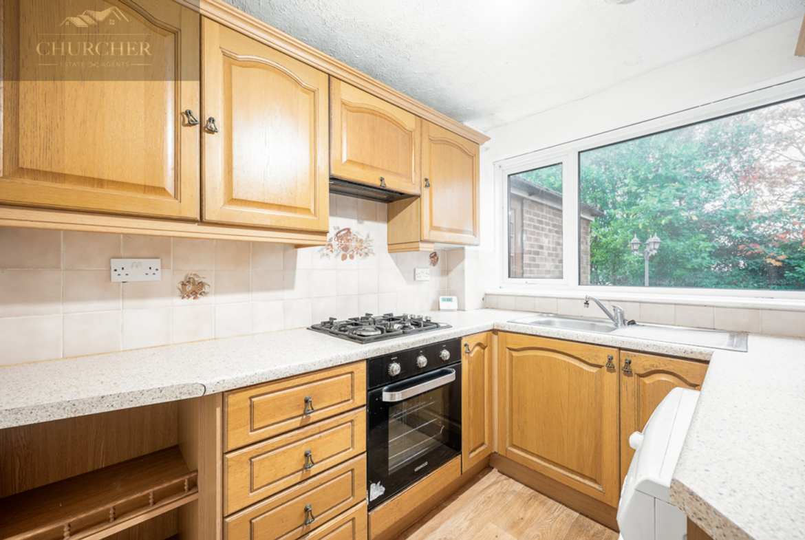 Upon entering at the side the property, you are greeted by a bright hallway that leads directly into the kitchen. The kitchen is fitted with a range of traditional wooden wall and base units complemented by modern worktops and tiled splashbacks. The large rear-facing window fills the space with natural light, while the wood-effect flooring gives the room a warm and modern feel.