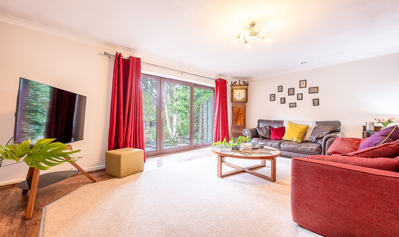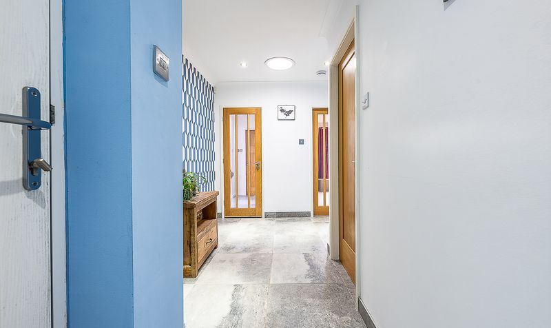 Approached via a private driveway providing ample off-road parking and access to the detached garage, the property sits comfortably within its surroundings, framed by mature trees and planting that immediately convey a sense of privacy. Stepping through the front door, you are welcomed into a wide and inviting entrance hall, finished with tiled flooring, soft neutral tones and solid internal doors, offering a practical and stylish introduction to the home.