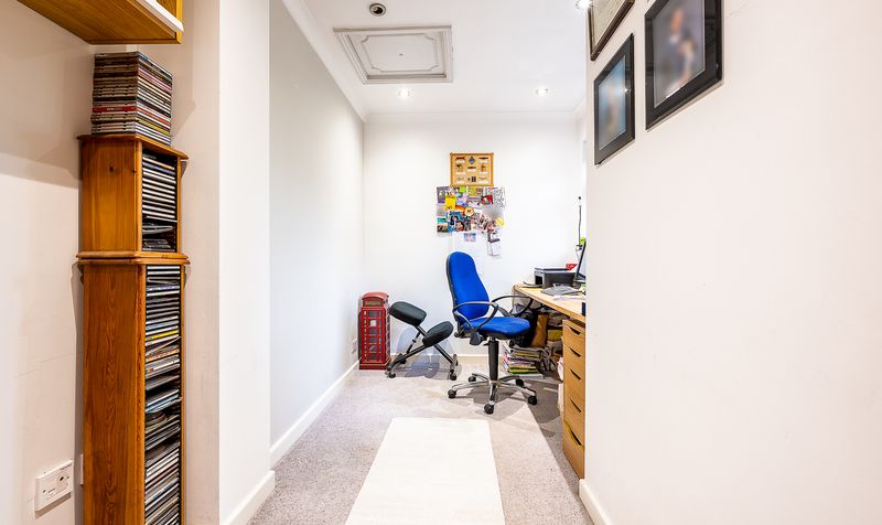 The bedroom accommodation is thoughtfully arranged to provide both comfort and flexibility. The main bedroom is a generous double, enjoying a calm outlook and benefitting from access to a contemporary Jack and Jill shower room, which is positioned between and shared by two of the bedrooms, and finished with modern tiling and fittings. Three further bedrooms are all well-proportioned, each offering versatility to suit a range of needs, whether as additional bedrooms, guest rooms or home office space. One of the bedrooms is currently arranged as a study, clearly demonstrating the flexibility of the layout.