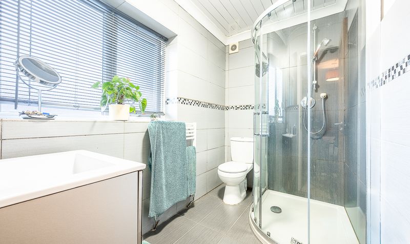 The family bathroom is positioned to serve the remaining bedrooms and is a particularly spacious and well-appointed room. Finished in a modern style, it features a contemporary suite with both bath and separate shower, sleek tiling and quality fittings throughout. Its generous proportions make it ideally suited to busy family life, providing both practicality and comfort for everyday use.