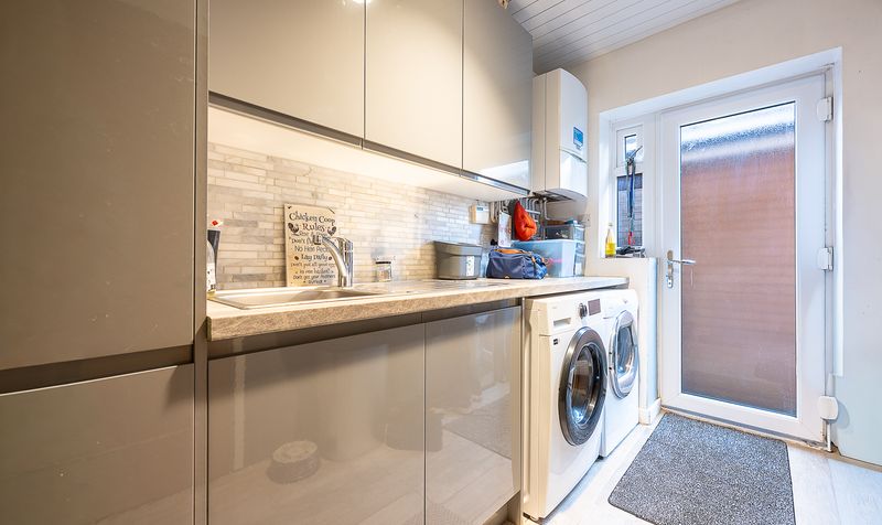 Practicality is well catered for with a separate utility room located just off the kitchen. Finished to match the main kitchen, it offers excellent additional storage, space for laundry appliances and direct access to the outside, ideal for busy family living.