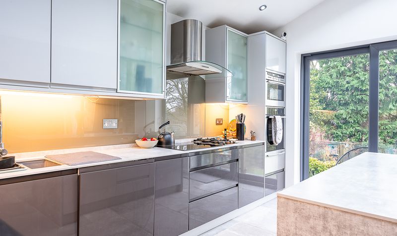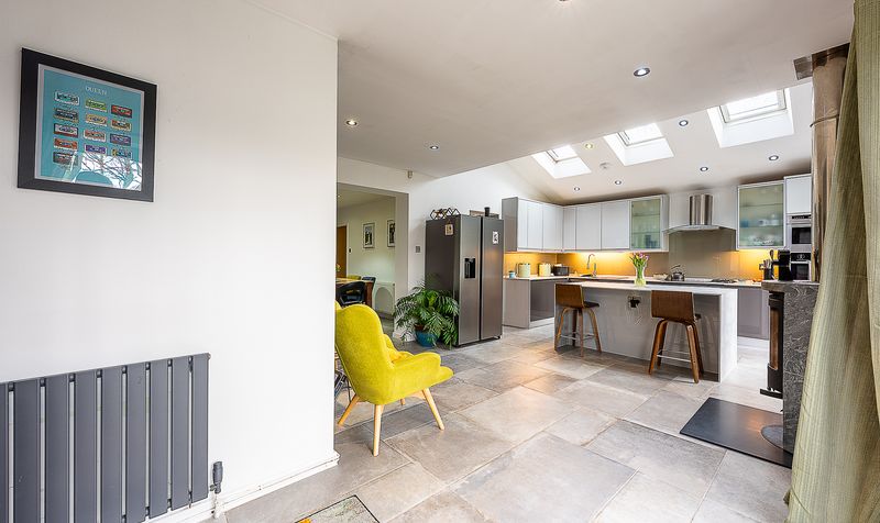 To the very rear, the kitchen and snug combine to form a truly standout living area. The kitchen is sleek and contemporary, fitted with high-gloss cabinetry, integrated appliances and generous worktop space, all centred around a substantial island that provides additional preparation space and informal seating. Skylights overhead flood the room with natural light, while large sliding doors open directly onto the rear terrace, seamlessly connecting the interior with the garden beyond. Adjoining the kitchen, the snug offers a cosy yet stylish retreat, featuring a modern wood-burning stove set against a brick-effect feature wall, creating a welcoming focal point and a perfect place to unwind while still enjoying views over the garden.