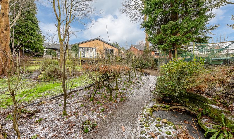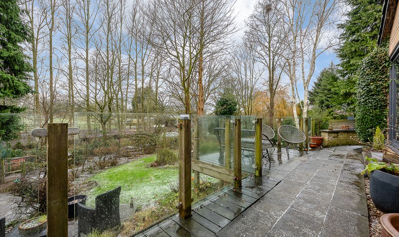 Externally, the rear garden is a true highlight of the property. Accessed directly from the kitchen and snug, the garden has been beautifully landscaped and enjoys a peaceful, leafy backdrop. A raised decked terrace with glass balustrade provides the perfect spot for outdoor dining or relaxing, offering elevated views across the lawn and mature planting beyond. The garden itself is generous and well-established, with winding pathways, shrubs, trees and lawned areas creating a private and tranquil setting that changes with the seasons. Additional patio areas provide further seating options, making this an ideal space for entertaining, gardening or simply enjoying the surrounding countryside.