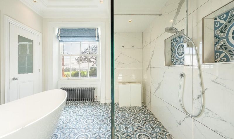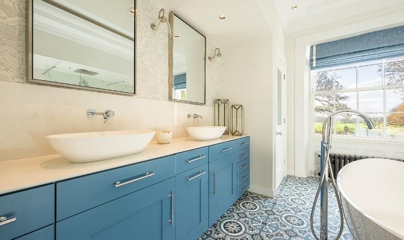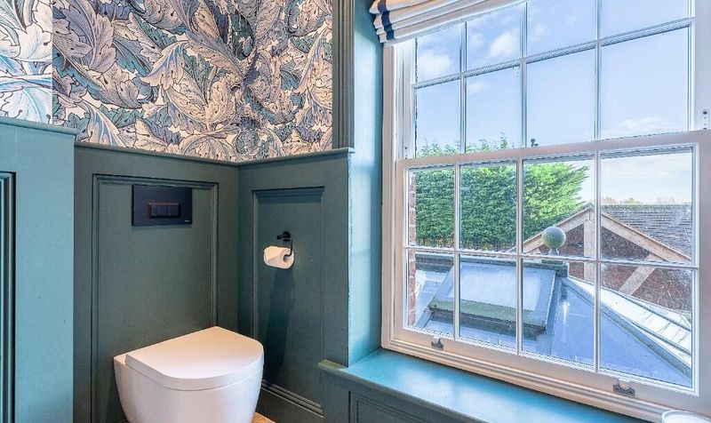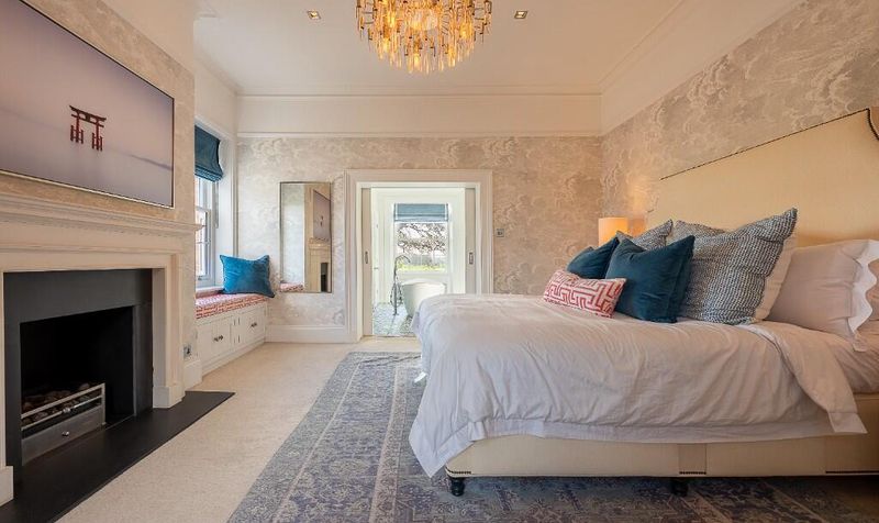 Upstairs, the main bedroom suite provides a haven of calm and luxury. Cloud-inspired wallpaper, a statement chandelier and dual sash windows create a light and soothing ambience, while a feature fireplace and window seating add elegant charm. The adjoining en-suite rivals a boutique spa, featuring a sculptural freestanding bath with countryside views, a marble-lined walk-in rainfall shower, twin vessel sinks and bespoke cabinetry – a truly indulgent space designed for recovery and relaxation.