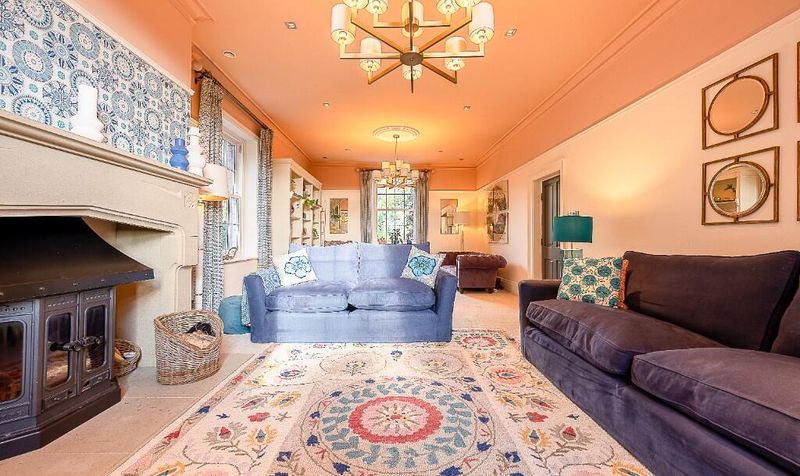 The formal lounge exudes sophisticated calm, with soft peach tones, rich textiles and bespoke detailing that work harmoniously to create a luxurious retreat. Twin chandeliers illuminate the length of the room, while a stone fireplace with artisanal tiling forms a striking focal point. Deep velvet sofas offer the perfect setting for unwinding after a day at Royal Birkdale or for hosting intimate, private gatherings in complete comfort.