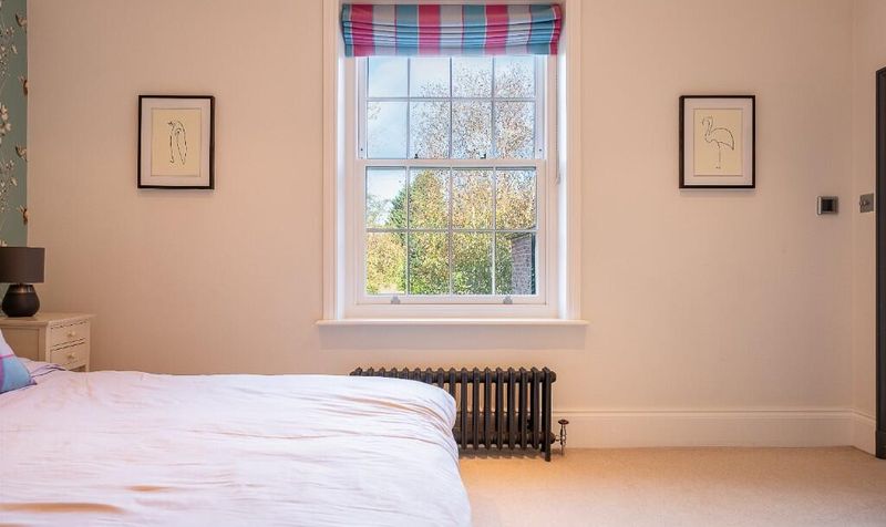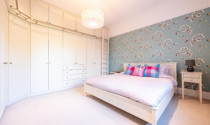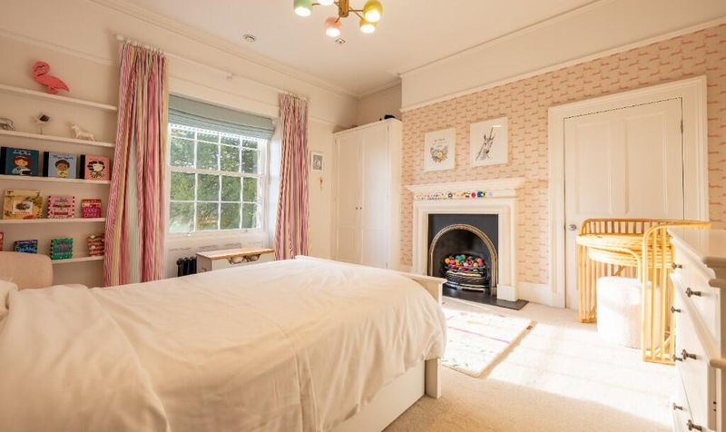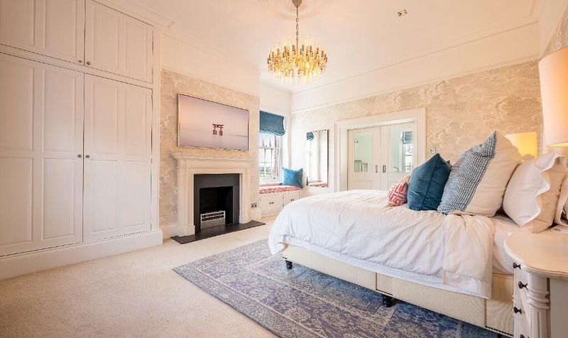 The remaining bedrooms are equally refined, each offering generous proportions, beautiful styling and superb comfort. One showcases soft grey tones and a contemporary mountain mural, another blends elegant floral wallpaper with warm natural light, while a third offers uplifting décor and bespoke shelving. These rooms provide luxurious accommodation for additional guests, family members, staff or security personnel, ensuring everyone enjoys a restful and private stay.