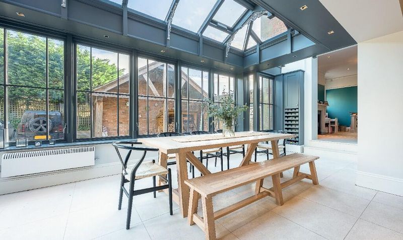 Flowing seamlessly from the reception rooms, the orangery dining room is one of the home’s most breathtaking features. Full-height glazing and a vaulted glass ceiling bathe the space in soft natural light, while views over the courtyard and gardens create a serene backdrop for catered breakfasts, leisurely lunches or refined private dining. Elegant and atmospheric, it is an extraordinary entertaining space for guests and corporate parties alike.