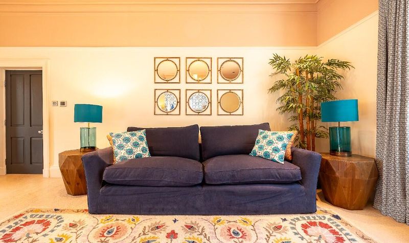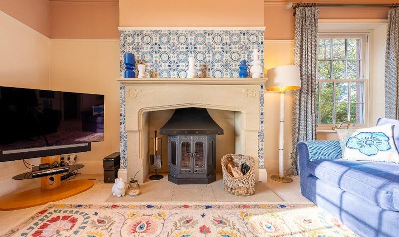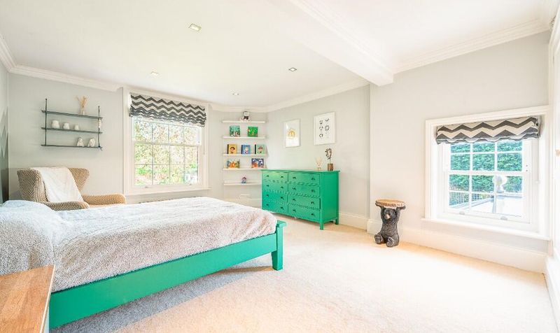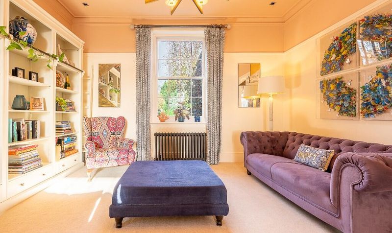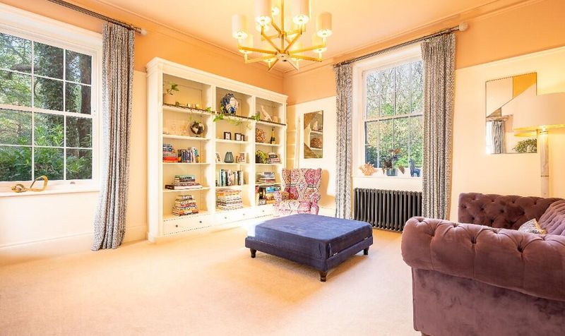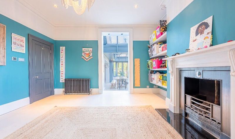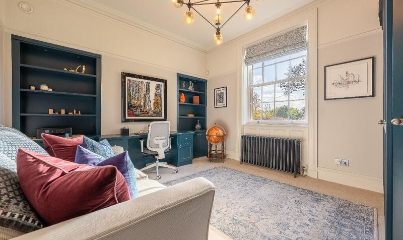 A second reception room provides a more contemporary and vibrant space, beautifully styled with teal walls, bespoke shelving and an elegant marble fireplace. Flooded with natural light and generous in size, it functions perfectly as an informal lounge, media area or creative breakout room – a versatile asset for guests requiring multiple relaxation zones during their stay.