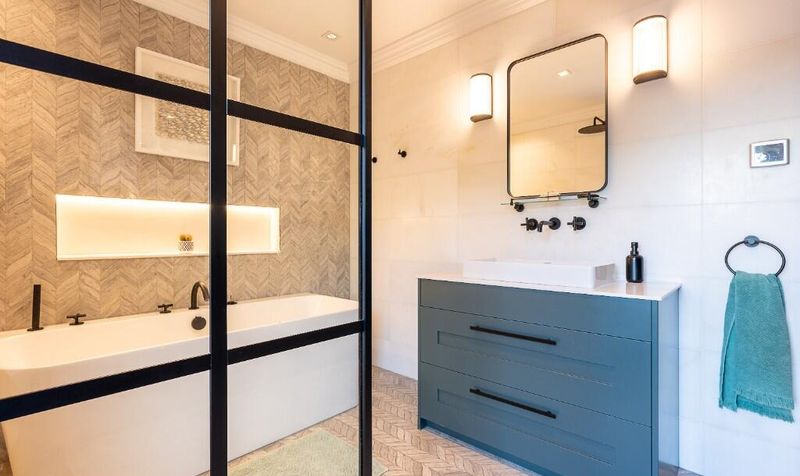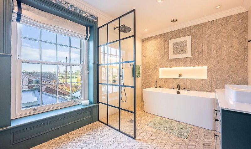 The luxury family bathroom continues the home’s exceptional standard, featuring a deep freestanding tub beneath a herringbone feature wall with an illuminated niche. A sleek black-framed walk-in shower and bespoke vanity complete this tranquil, spa-like retreat – the ideal place for guests to unwind after long days at the tournament.