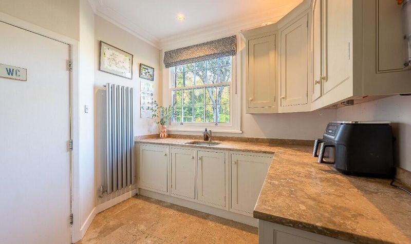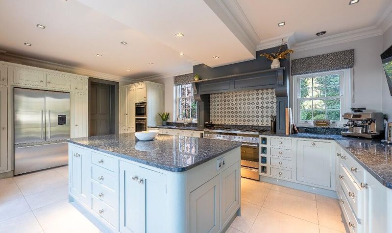 The designer kitchen is crafted to exceptional standards, centred around a grand granite-topped island and enhanced by hand-painted cabinetry and a feature range cooker framed by decorative tiling. Whether used by a private chef or enjoyed personally, it is a space perfectly suited to Open-week living – practical, elegant and ideally designed for both relaxed dining and professional catering.