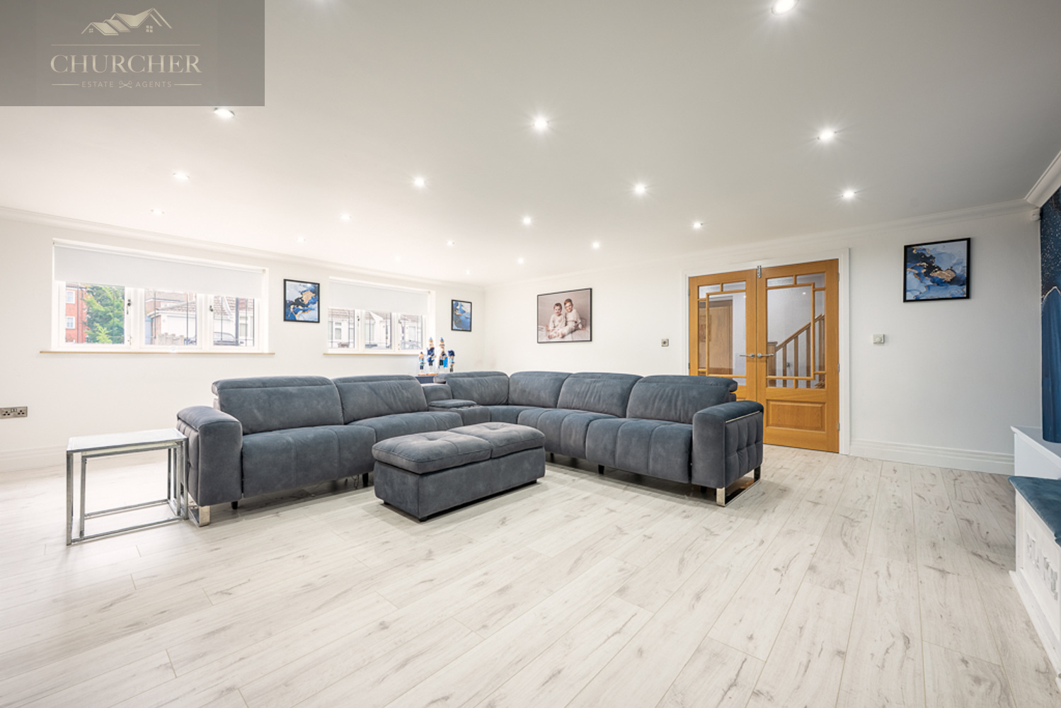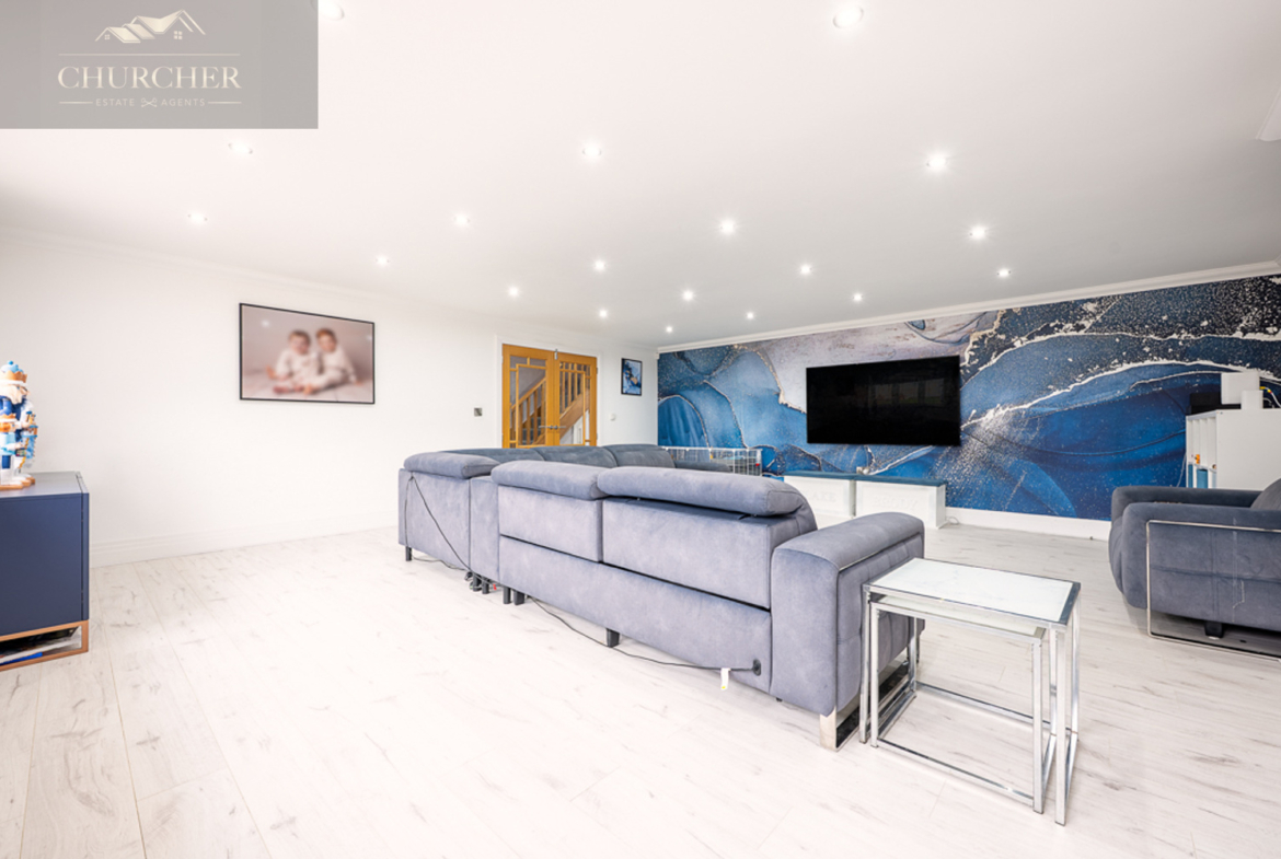 At the front of the property sits the beautifully bright and expansive lounge, designed to offer both comfort and versatility. Flooded with natural light from the large front-facing windows, this impressive room has been tastefully decorated to create a calm and welcoming atmosphere, perfect for everyday family life or entertaining guests. Its generous proportions easily accommodate multiple seating areas while still leaving ample room for a dining table if desired. The room is elegantly finished with light wood-effect flooring and recessed ceiling spotlights, enhancing its airy and contemporary feel. A striking feature wall with a bold blue and white abstract design provides a stunning focal point, perfectly framing the media area with a wall-mounted television. Elegant double doors open through to the hallway, maintaining a smooth flow throughout the ground floor and enhancing the home’s sociable layout.