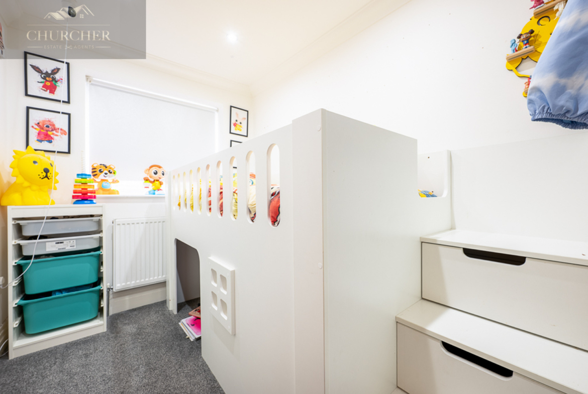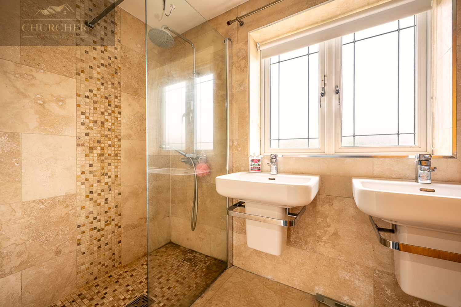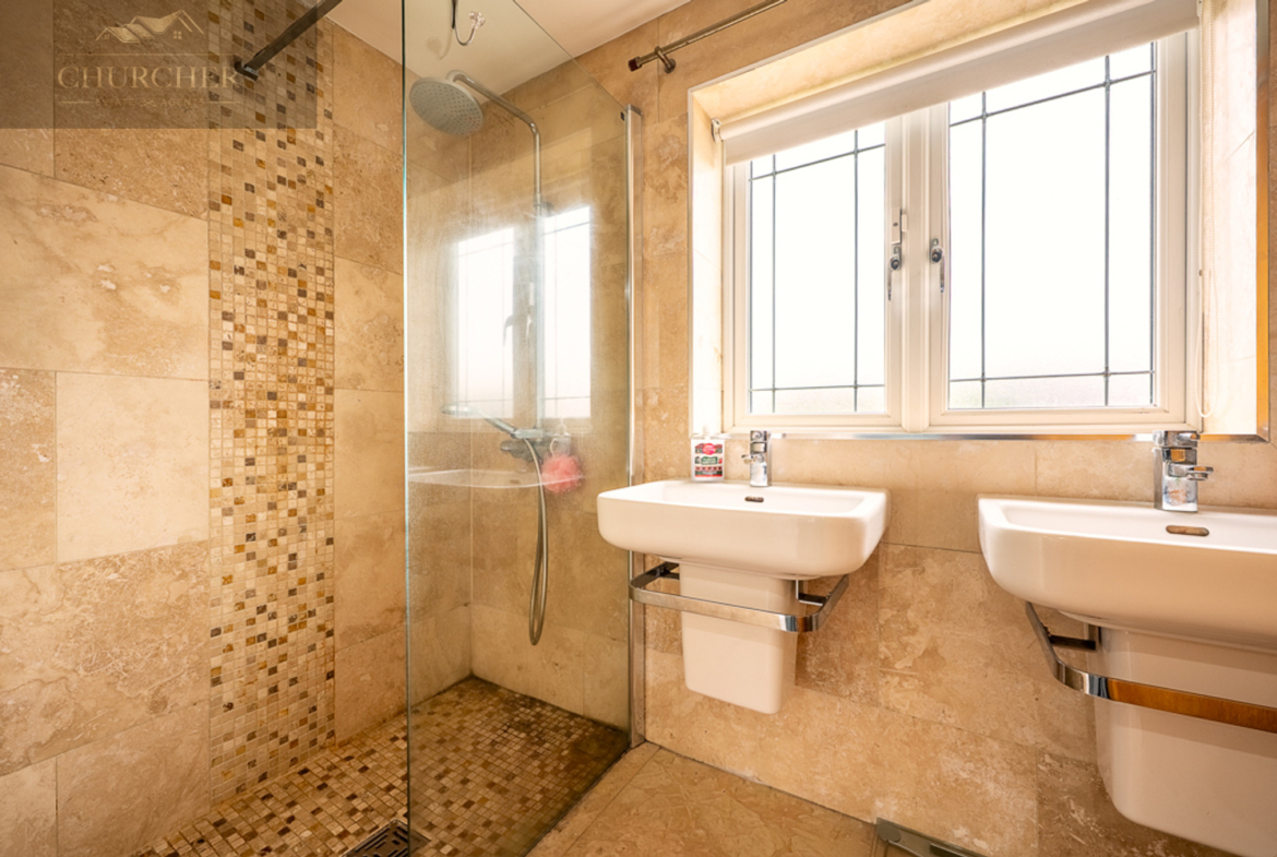 Upstairs, the home continues to impress with four well-proportioned bedrooms. The main bedroom is a fantastic size, offering a calm and elegant retreat with built-in wardrobes and plenty of room for extra furniture or a dressing area. The stylish en-suite bathroom is beautifully finished, featuring twin sinks, a luxurious walk-in rainfall shower, and modern neutral tiling-creating a spa-like atmosphere. The additional bedrooms include two spacious doubles, both light and inviting, and a fourth single bedroom that would make a perfect nursery, home office, or dressing room depending on your needs.