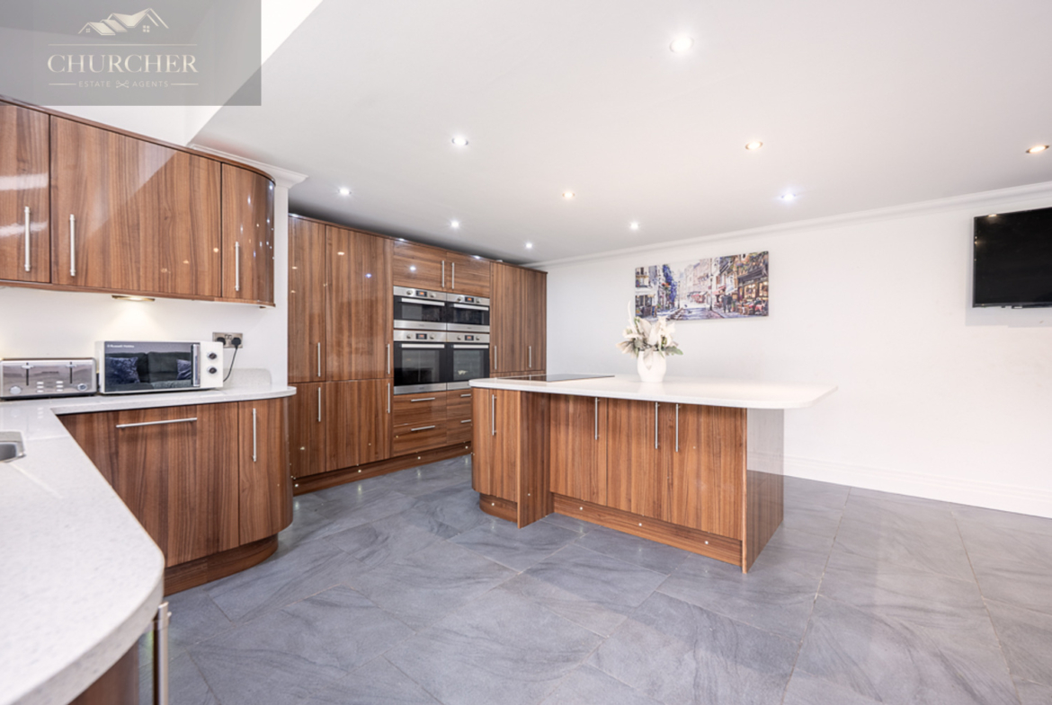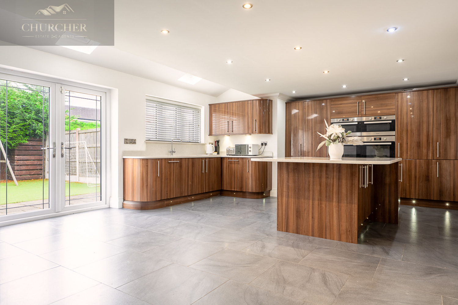 To the rear of the property lies the showstopping open-plan kitchen, dining, and family area-the true heart of this impressive home. Offering a perfect balance of contemporary elegance and everyday practicality, the space has been finished to an exceptional standard throughout. The kitchen area is beautifully fitted with a stunning range of high-gloss walnut-effect units that exude warmth and sophistication, perfectly complemented by luxury stone-effect worktops. A suite of high-end integrated appliances, including double ovens and an induction hob, ensures seamless functionality for even the most passionate home cook. The large central island acts as a striking focal point, offering additional workspace and a casual breakfast bar-perfect for morning coffees, informal dining, or social gatherings with friends.